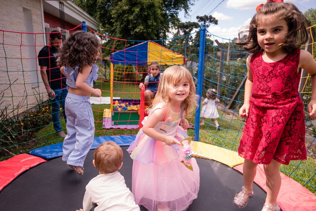 3 aninhos de uma garota independente, com um sorriso lindo, que ama unicórnios e cama elástica. Como foi linda a tarde em comemoração ao aniversário da Maria Aurora - tudo do jeitinho dela, nada posado.