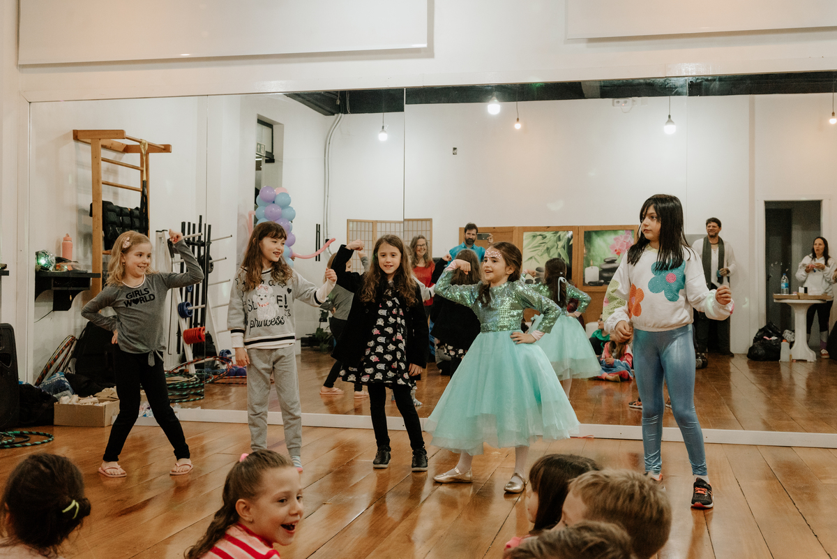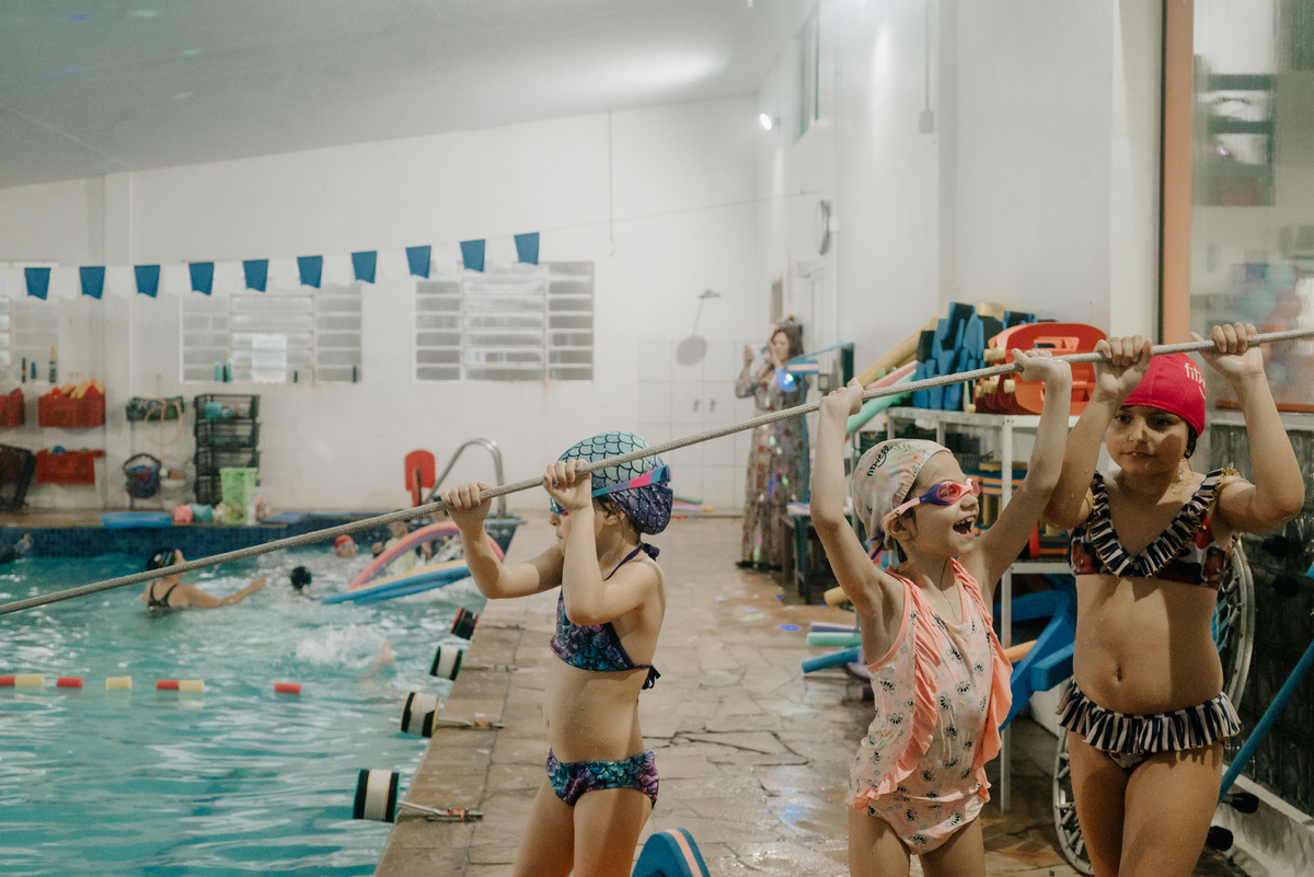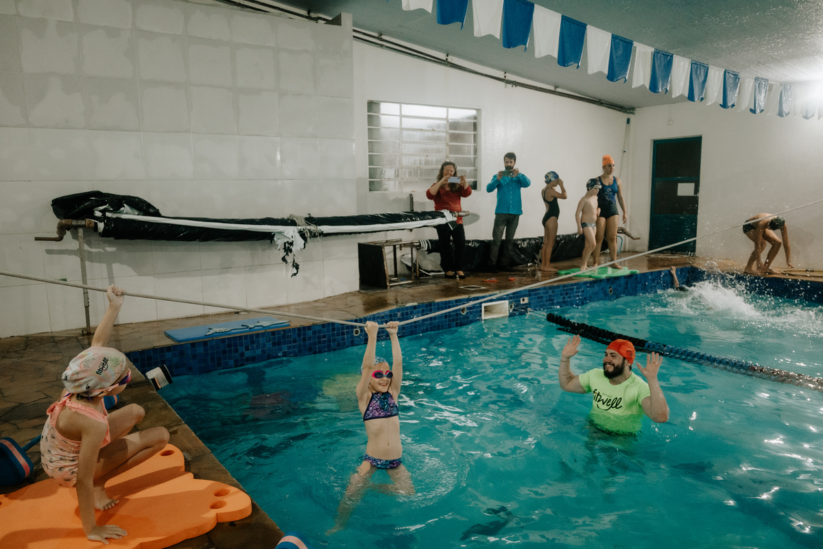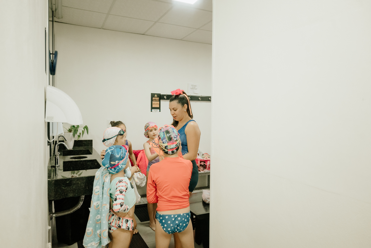 A programação pras crianças iniciou na piscina, com professores mais que simpáticos, dando todo o auxílio e criando percursos pra total diversão dos pequenos. Tanto pra quem sabe nadar quanto pra quem não possui experiência. Depois cantamos parabéns, a Maya desfilou seu novo modelito e, por fim, brincadeiras enquanto aguardávamos os pais.