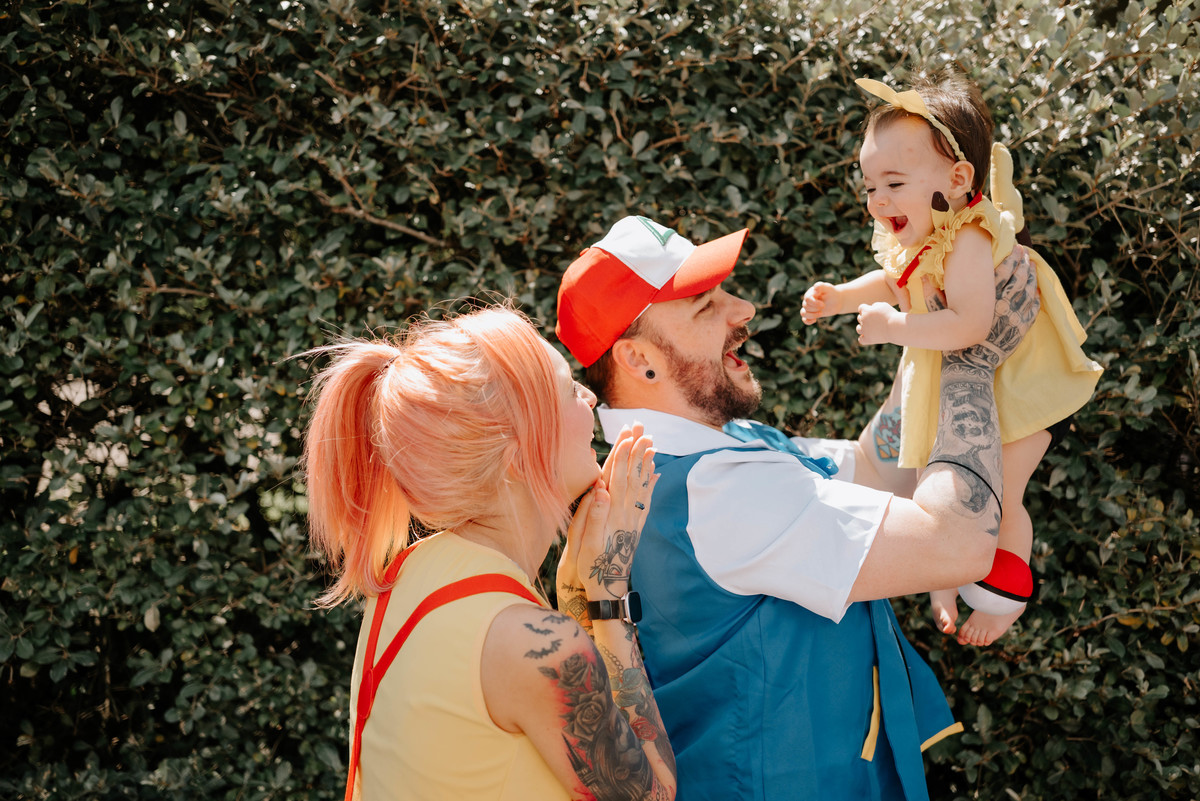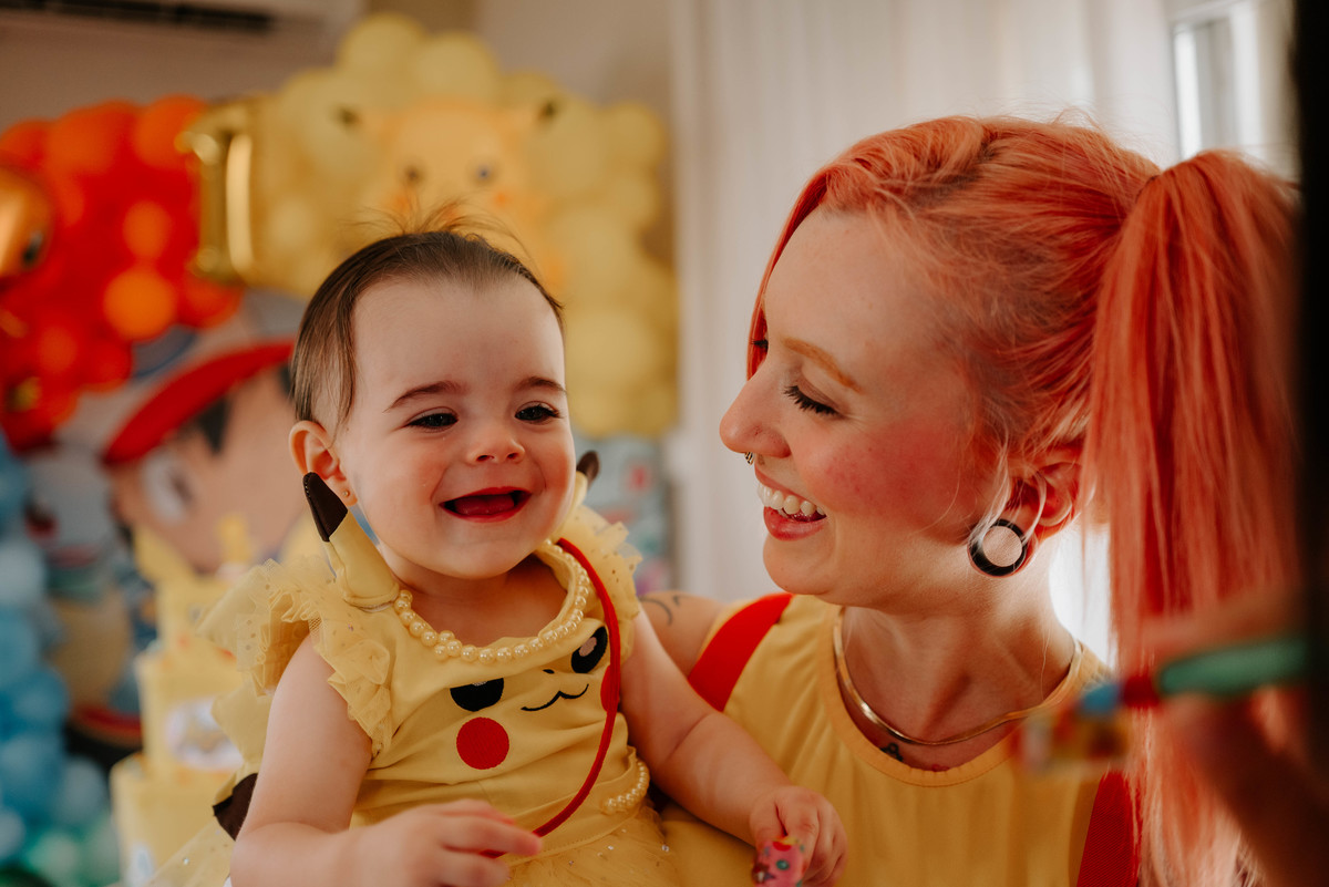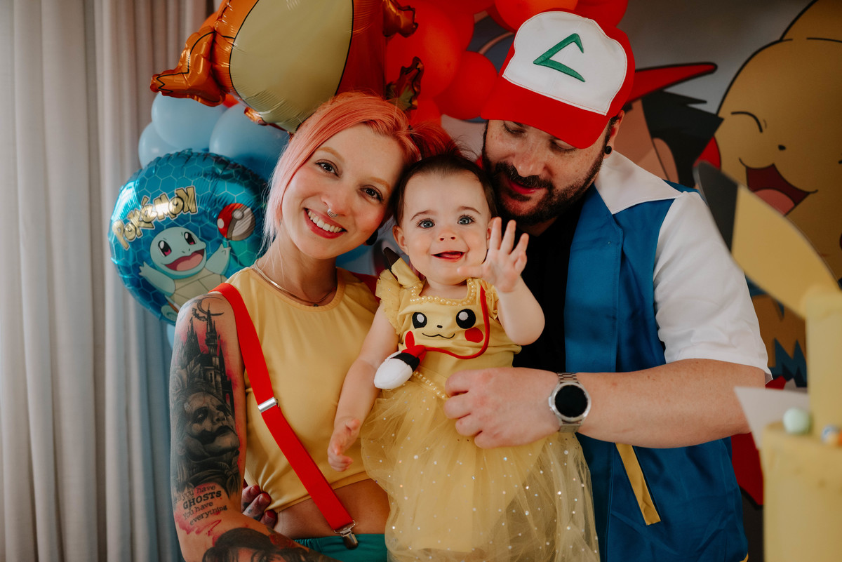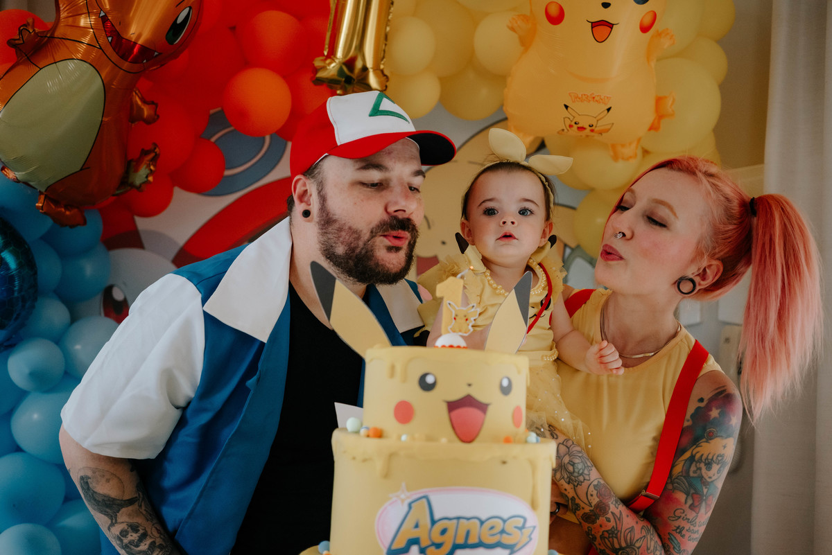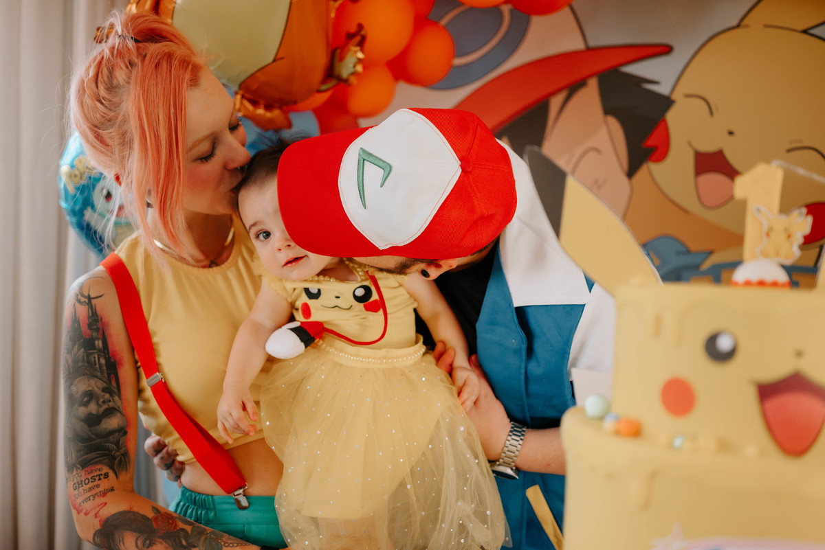 Os pais da Agnes são apaixonados pelo universo geek e fazem cosplays incríveis. Então a temática escolhida para celebrar o primeiro aninho dela foi Pokémon — cheia de cores, personagens e muitos detalhes que refletiam perfeitamente a personalidade da família.