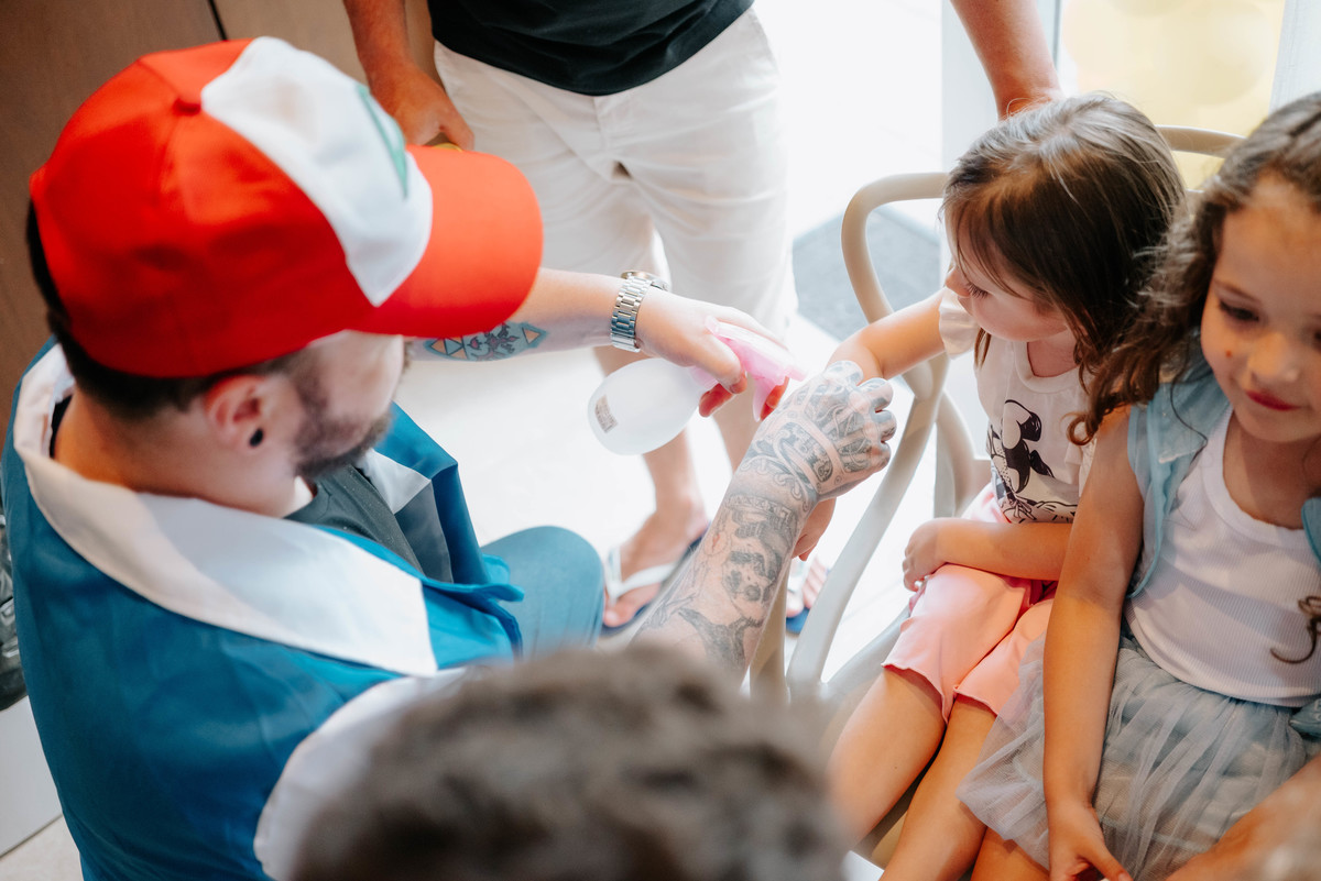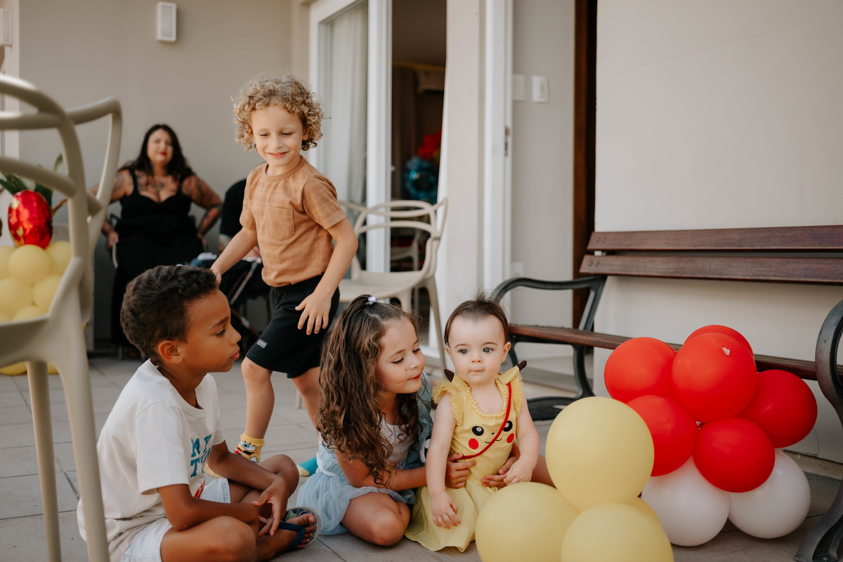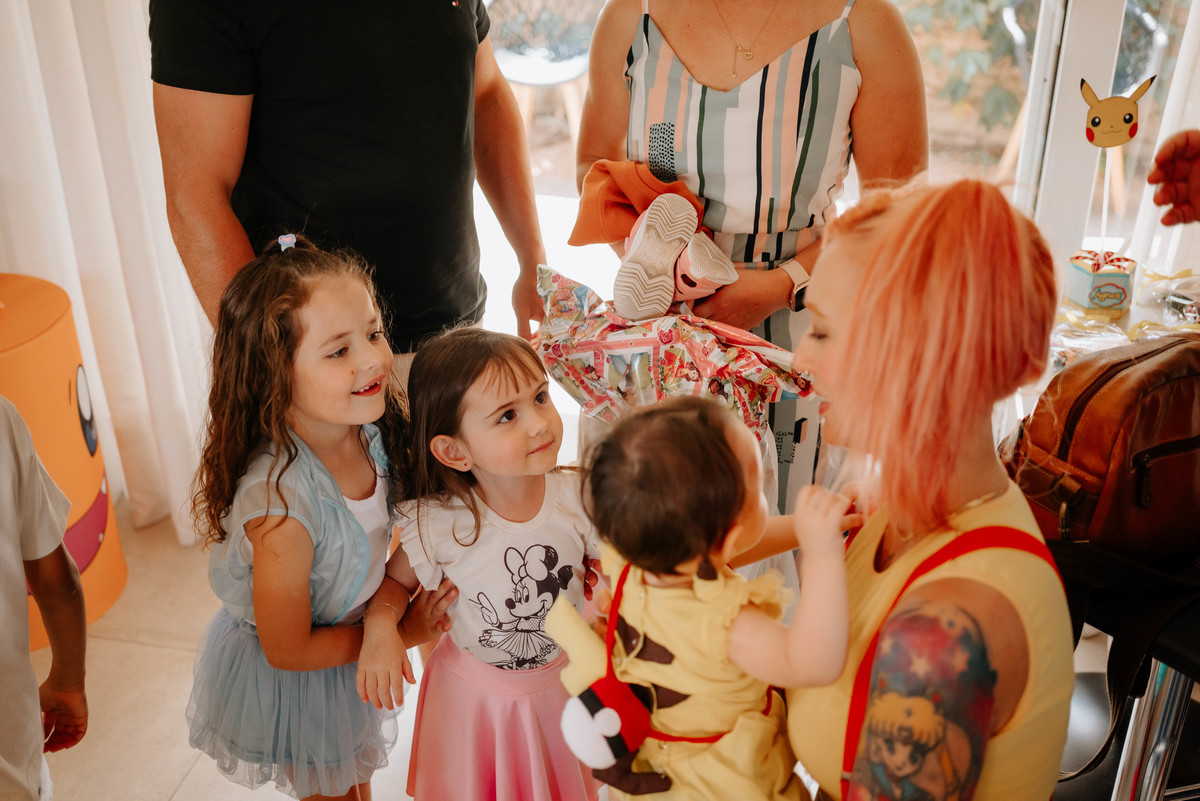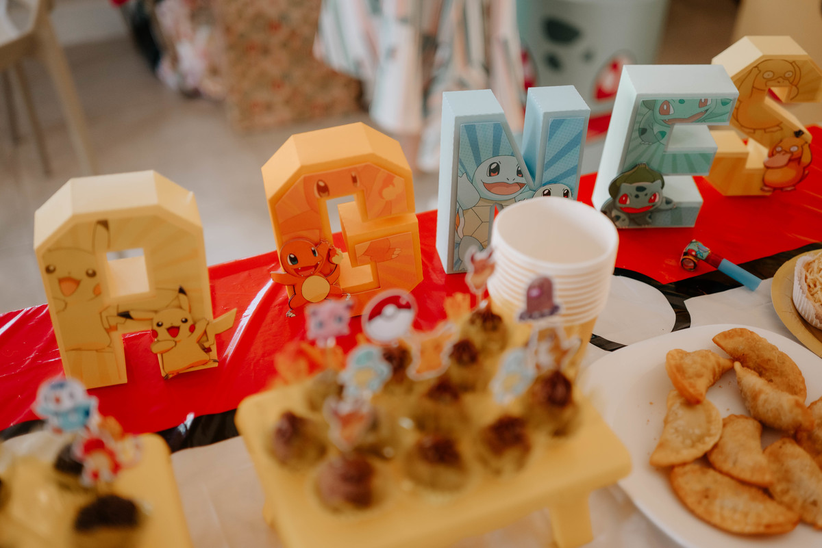 Cada cantinho da festa parecia ter saído diretamente de um episódio do desenho. Pikachu, Pokébolas e vários outros personagens estavam espalhados pela decoração, criando um ambiente divertido e cheio de magia. Mas o que realmente tornava tudo especial era ver como cada detalhe carregava um pouco da história deles.