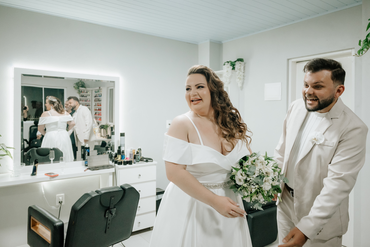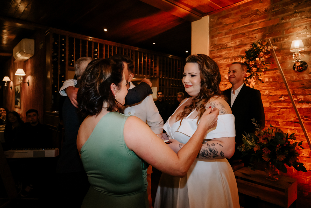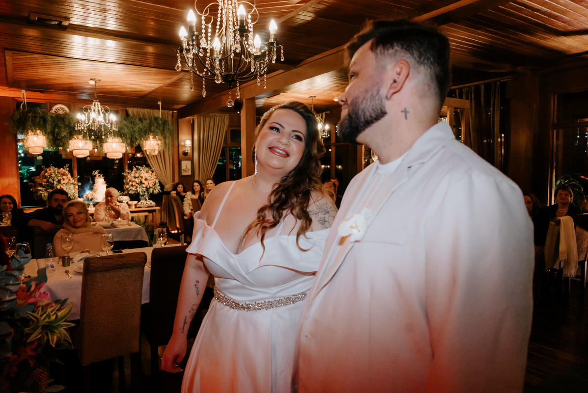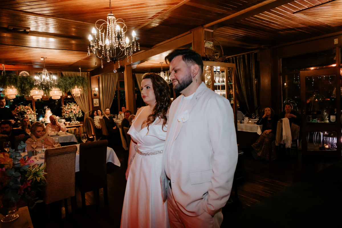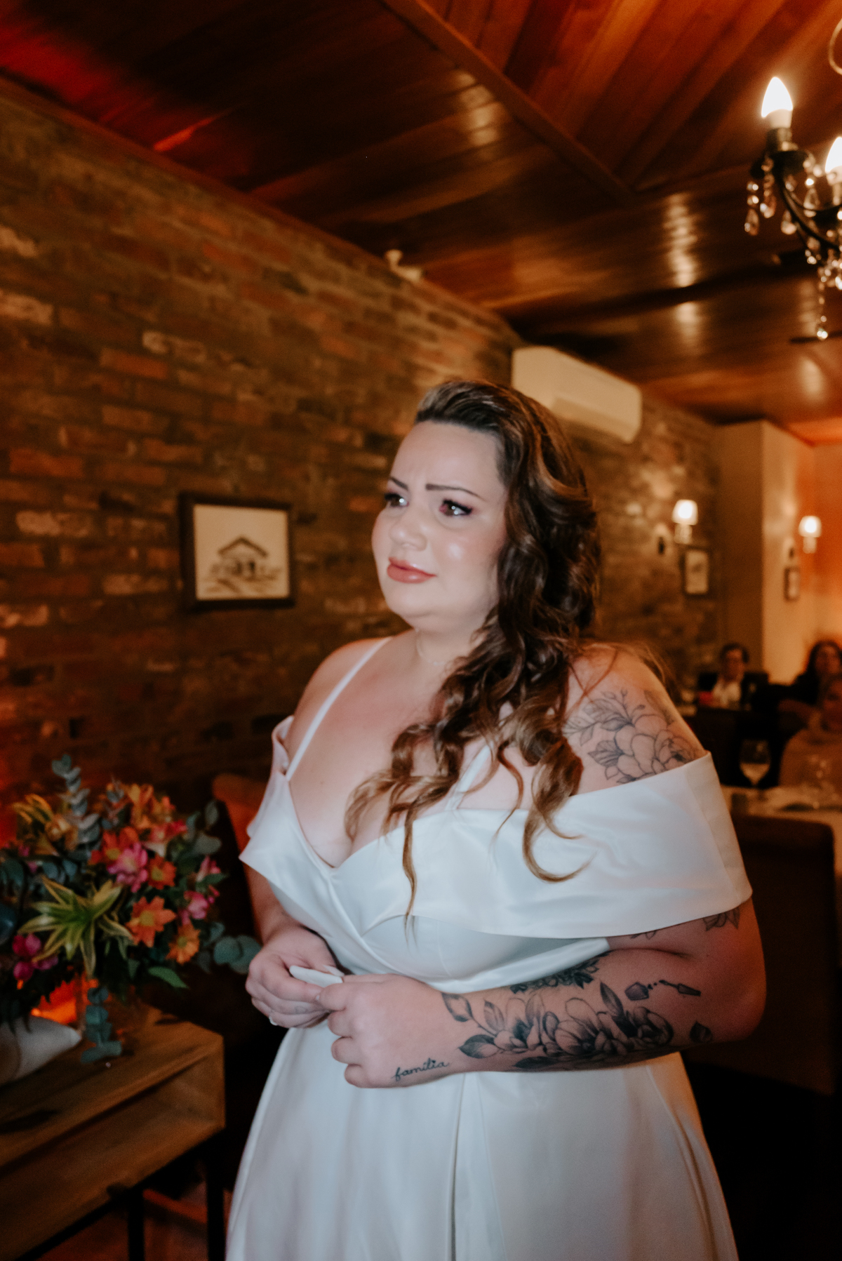 Desde o início, tudo foi diferente — e lindo. A mãe da noiva foi quem a arrumou, em um momento íntimo e cheio de emoção. Os noivos se viram antes da cerimônia e foram juntos para o evento, celebrando o companheirismo que os une. A cerimônia aconteceu em um fondue acolhedor de uma amiga do casal, o que trouxe ainda mais proximidade e afeto ao momento.