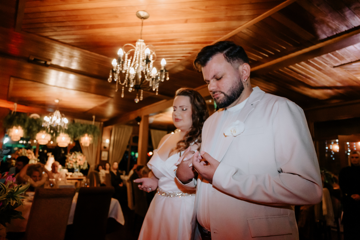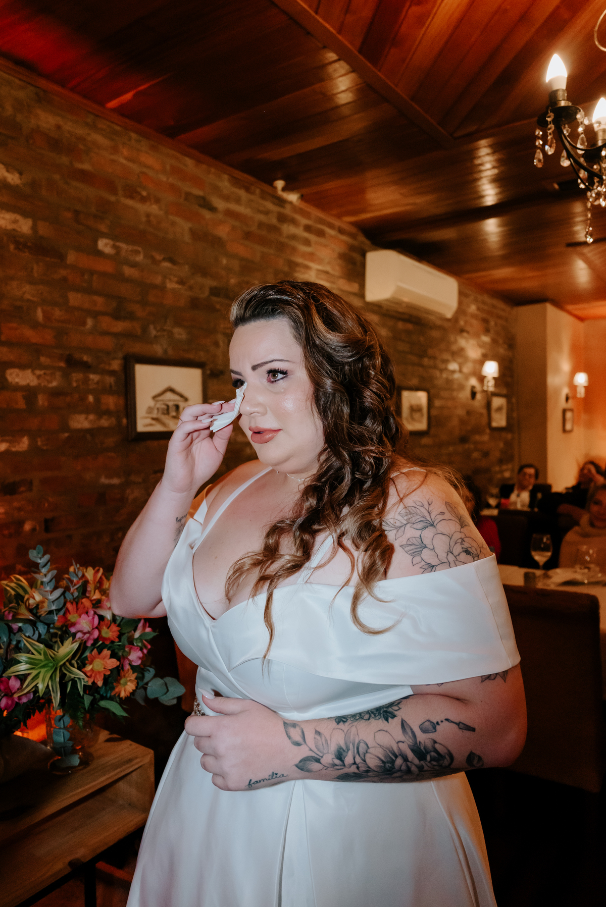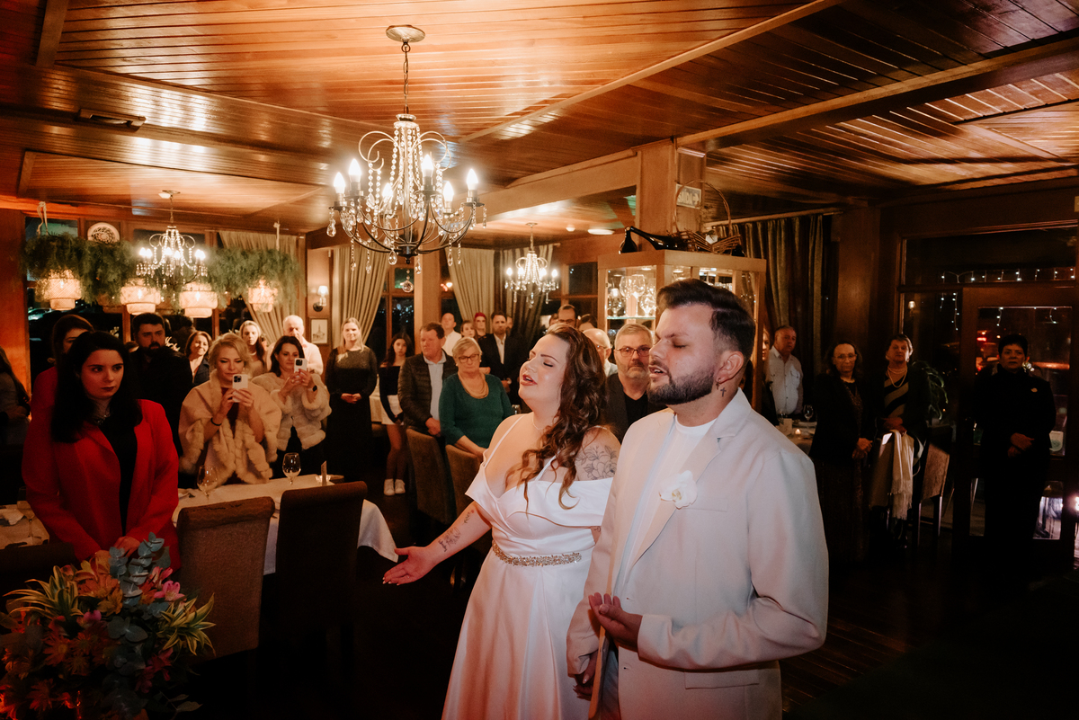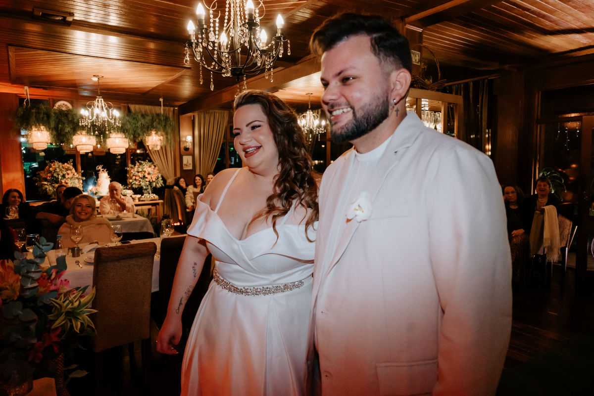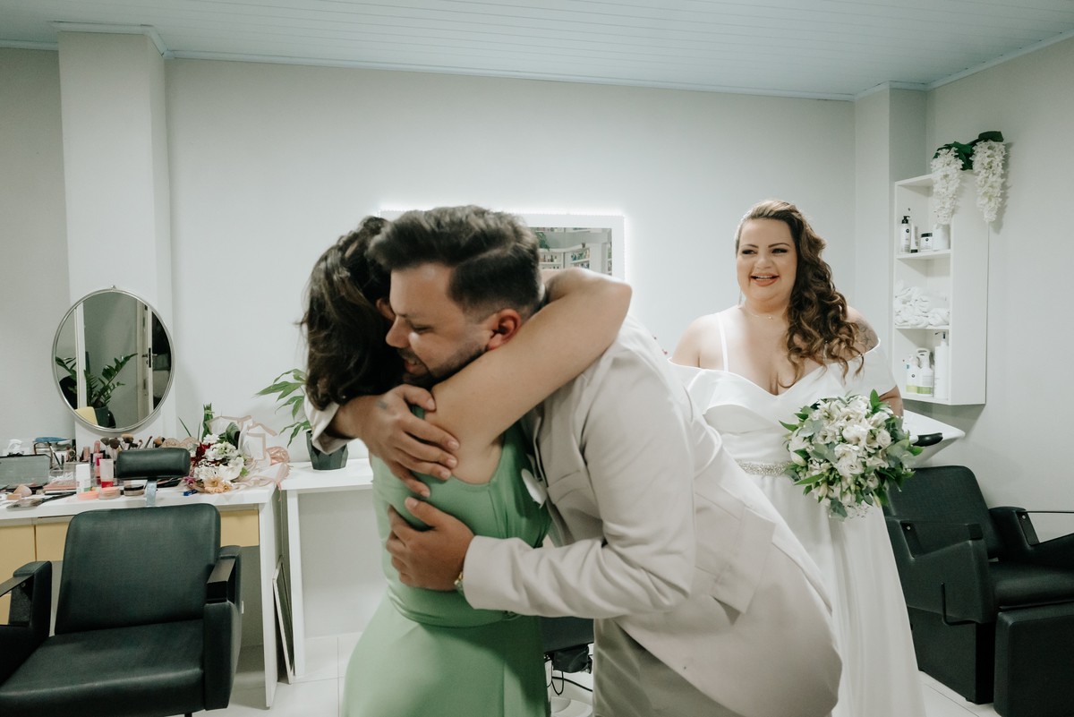 Desde o início, tudo foi diferente — e lindo. A mãe da noiva foi quem a arrumou, em um momento íntimo e cheio de emoção. Os noivos se viram antes da cerimônia e foram juntos para o evento, celebrando o companheirismo que os une. A cerimônia aconteceu em um fondue acolhedor de uma amiga do casal, o que trouxe ainda mais proximidade e afeto ao momento.