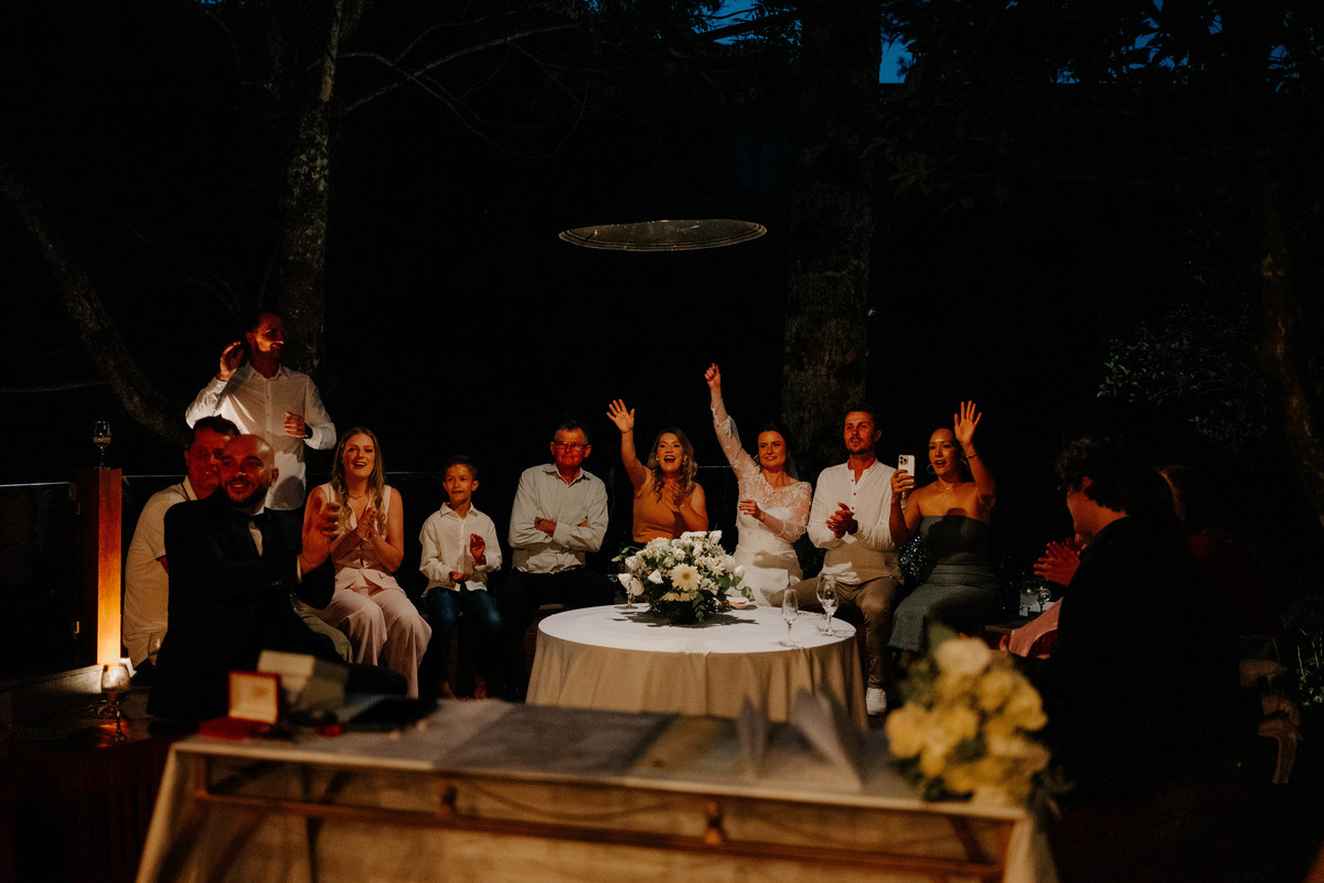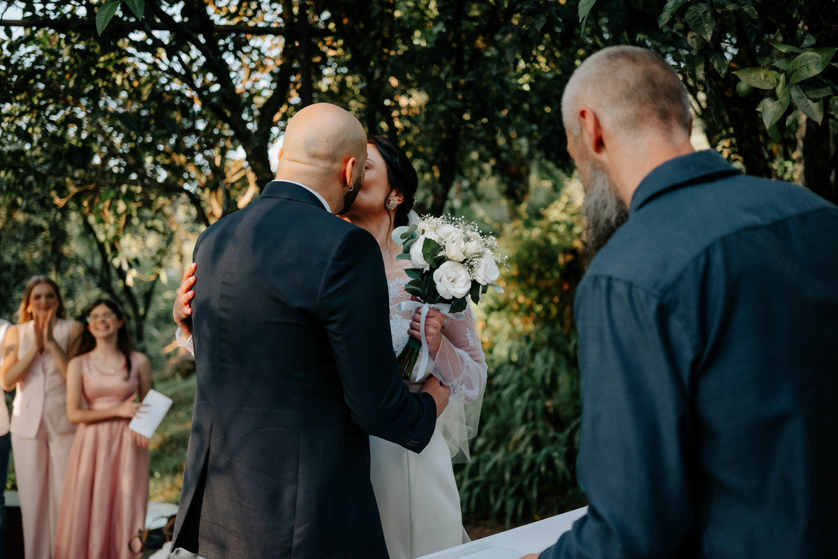 Sem protocolos rígidos ou grandes formalidades, a cerimônia foi leve e profundamente emocionante. Era possível sentir o quanto aquele momento representava uma escolha consciente: celebrar o amor ao lado de quem realmente faz parte da caminhada.