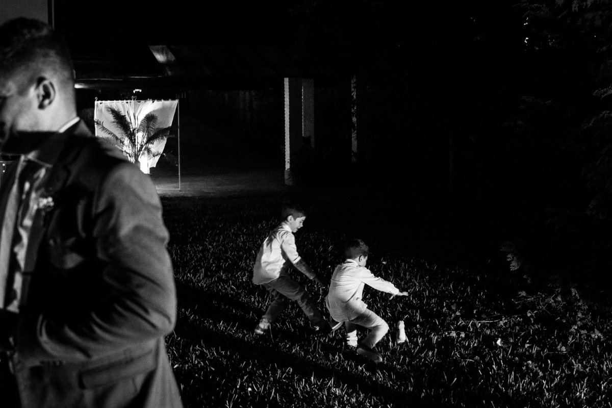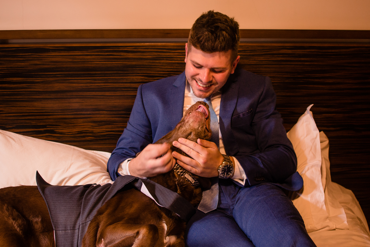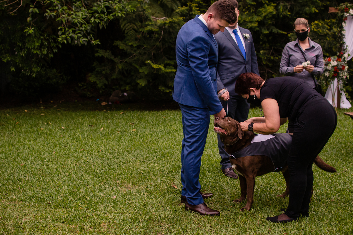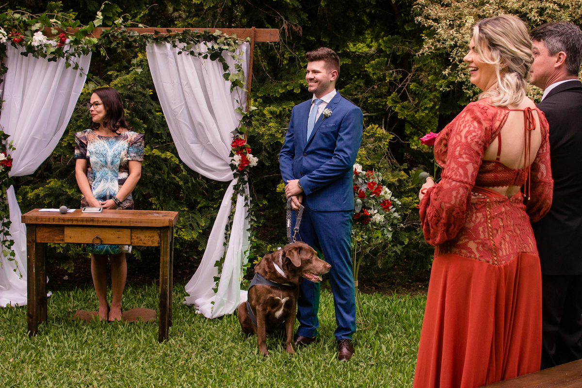 Encontrei a Ana tranquila, quando me despedi do making of a deixei tremendo no quarto. Encontrei o Maico pedindo uma pasta de dente no banheiro, deixei ele finalizando o cabelo. Corri para o local da cerimônia, vi colocarem as alianças na coleira do Bob e já comecei a me emocionar - impossível não imaginar meus 7 cachorros fazendo o mesmo por mim e minha esposa, que sonho.