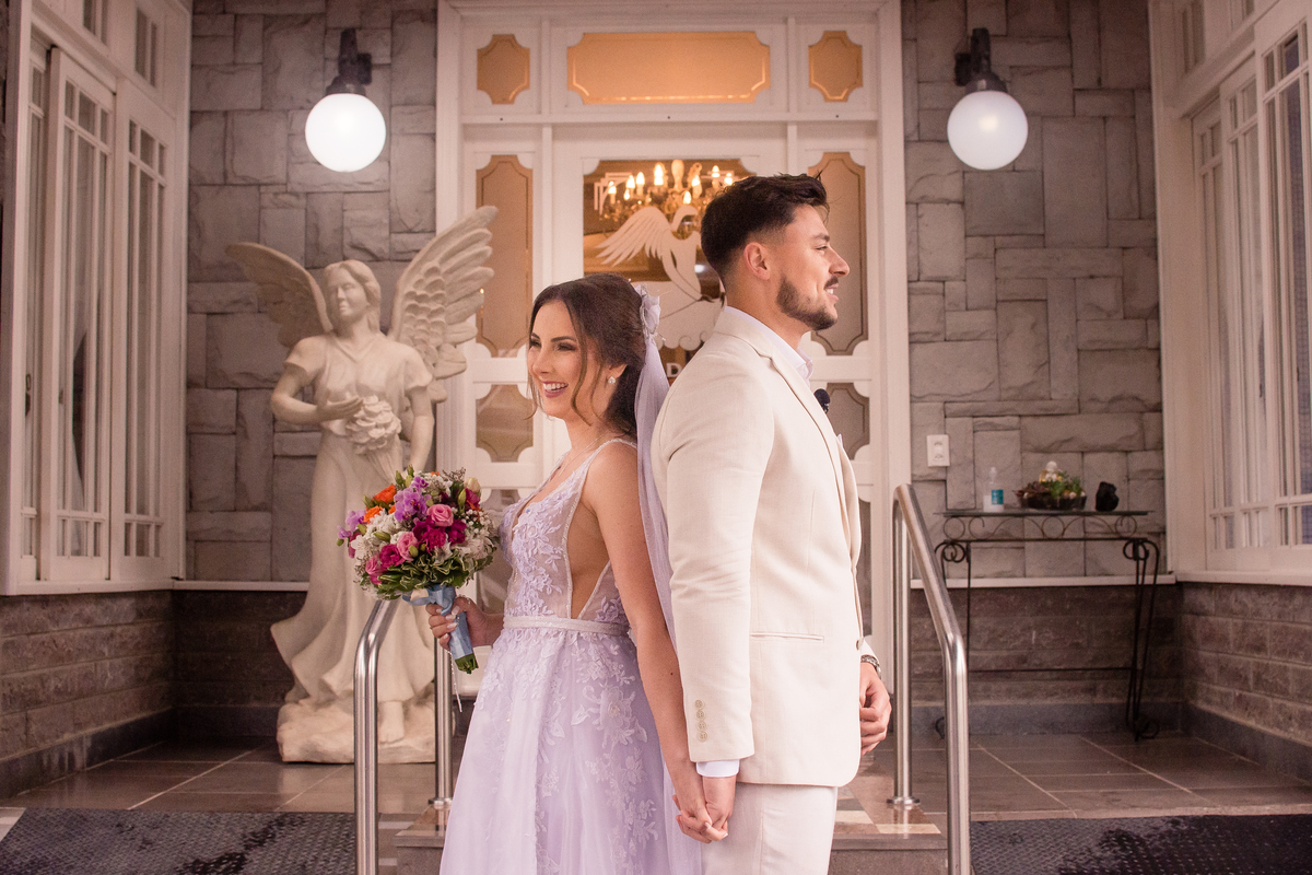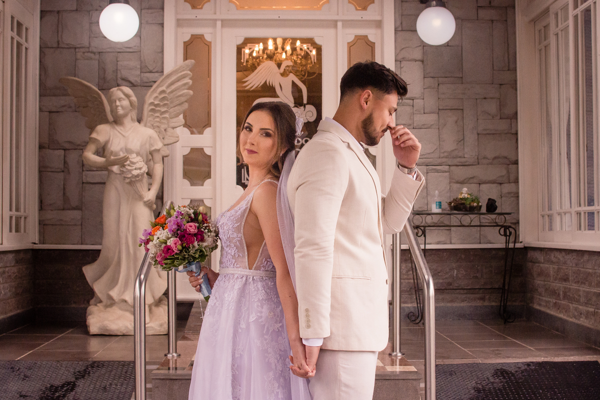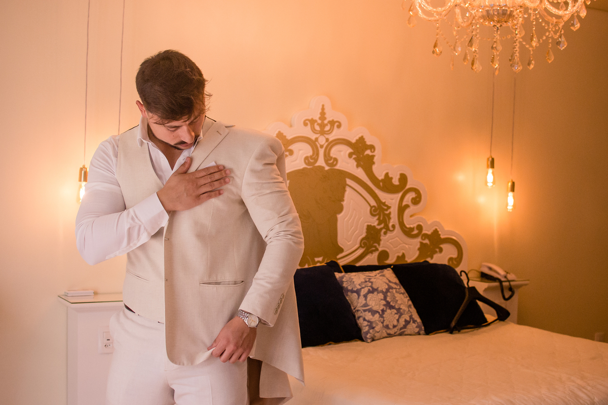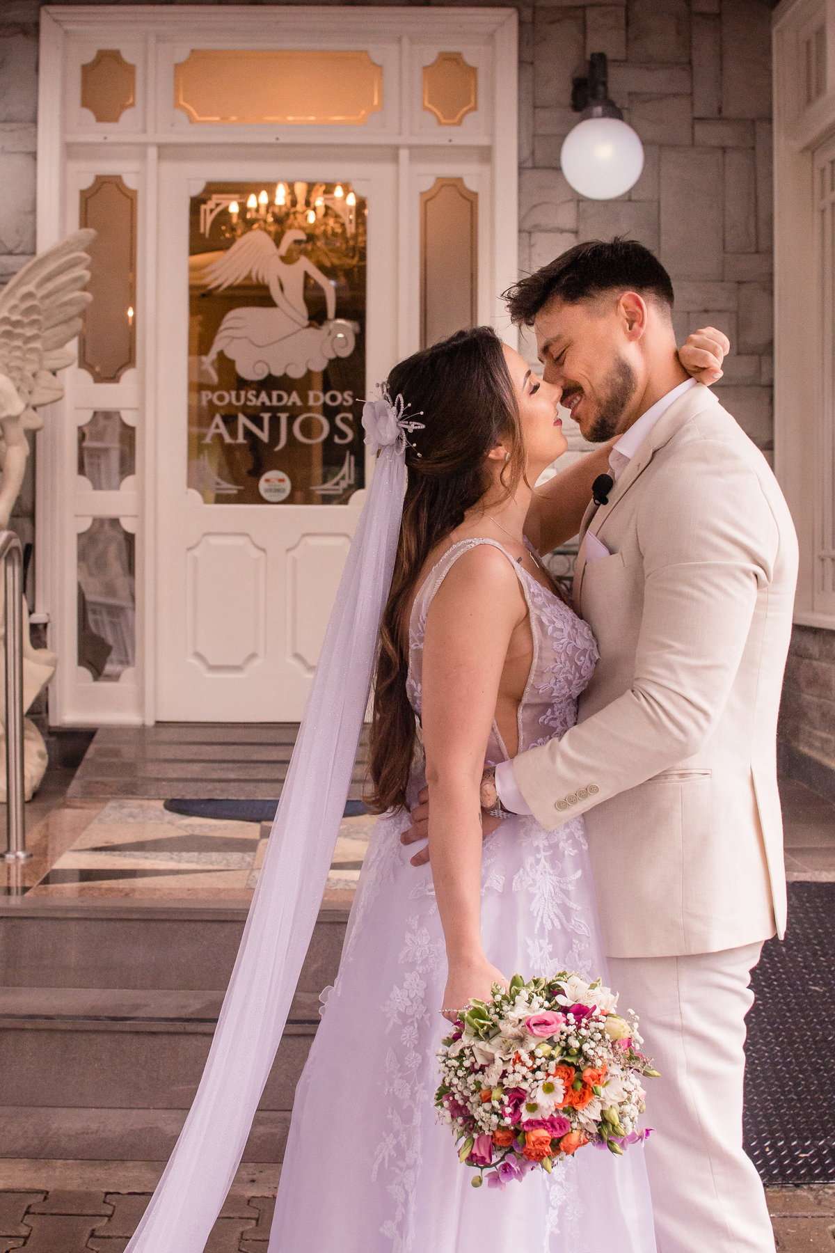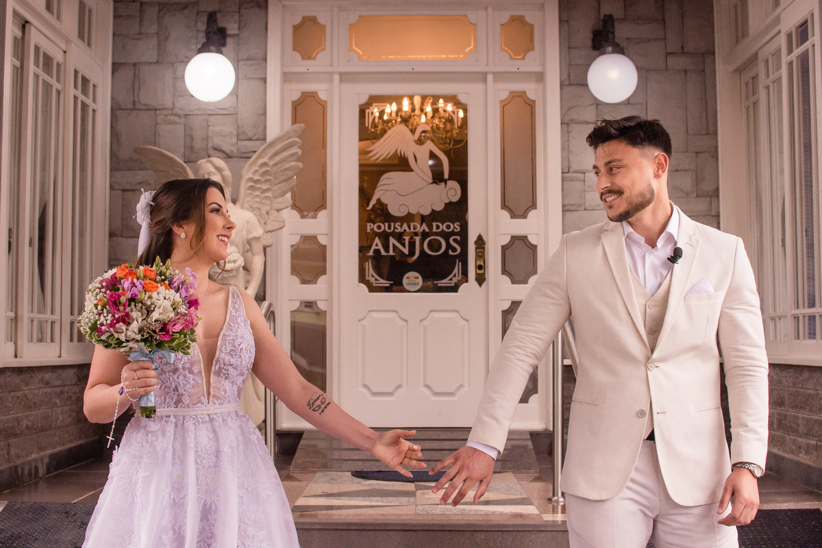 Ao chegar na Pousada dos Anjos, onde a Bruna e o Vitor se arrumaram, percebi o brilho no olhar e a ansiedade logo de cara. Foi lindo ver o carinho entre eles, a troca de carícias mesmo que à distância, a energia estava surreal.