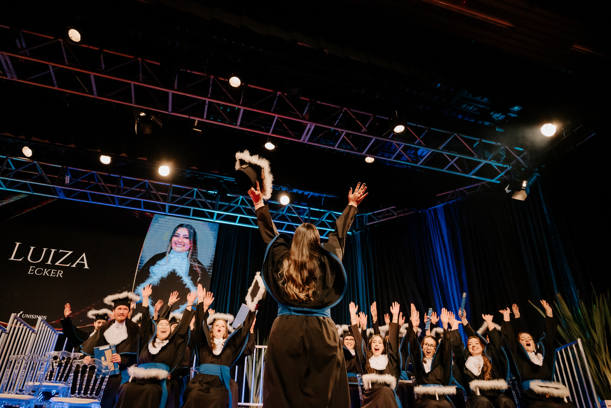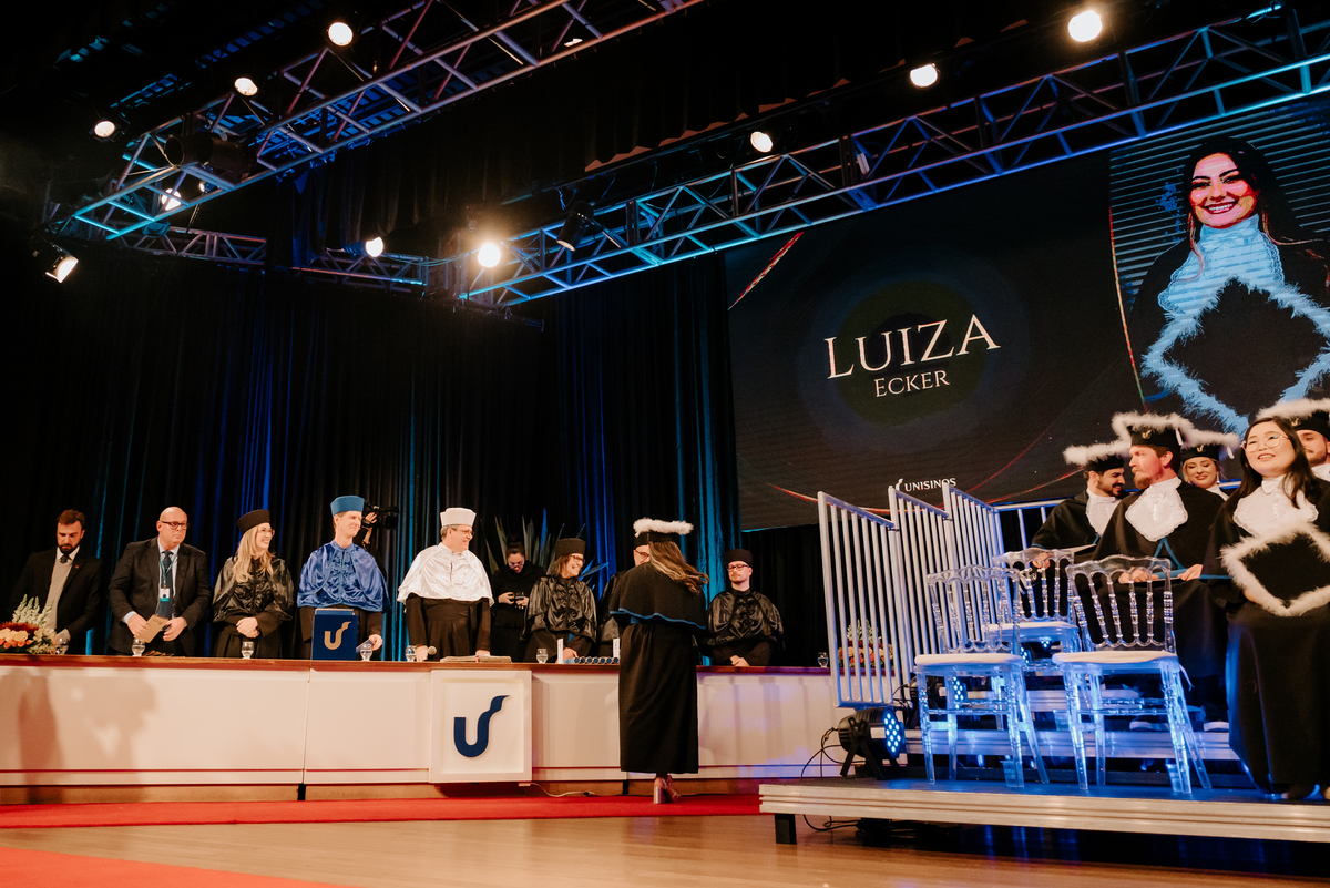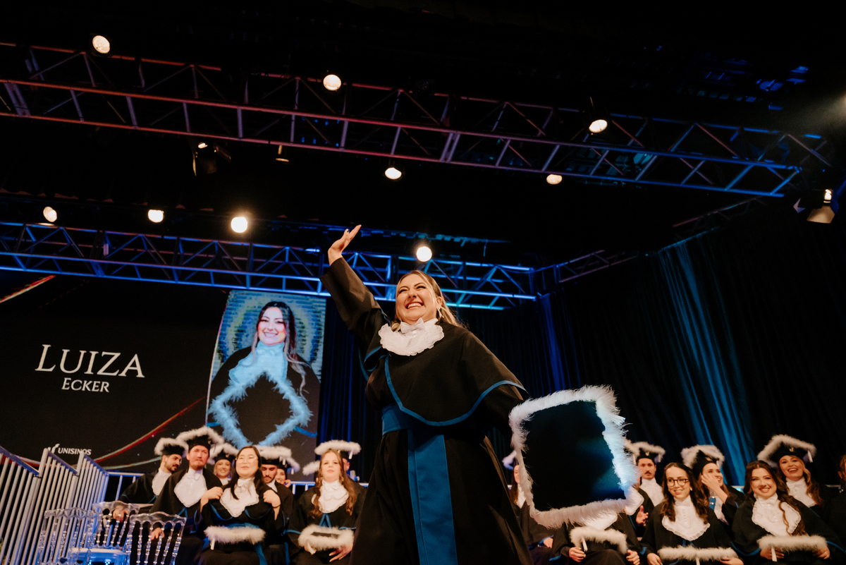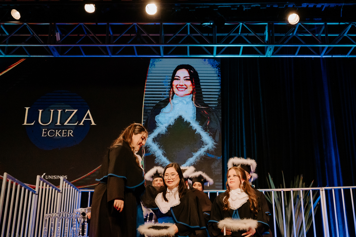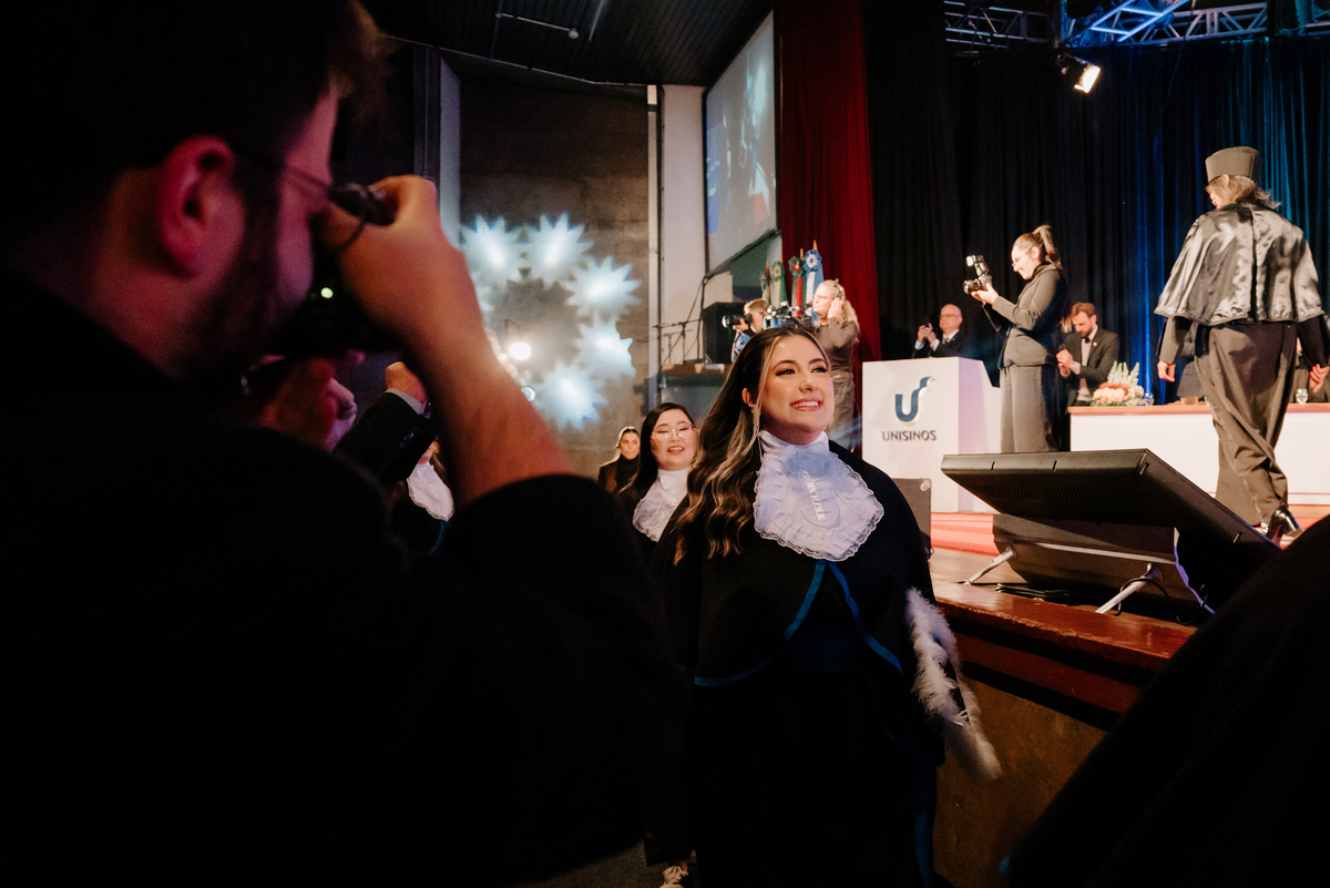 A cerimônia de colação de grau aconteceu na Unisinos, em São Leopoldo, reunindo colegas, professores e familiares em um momento de pura emoção. Cada olhar, abraço e sorriso carregava o peso de anos de dedicação, noites de estudo e o sonho finalmente realizado.