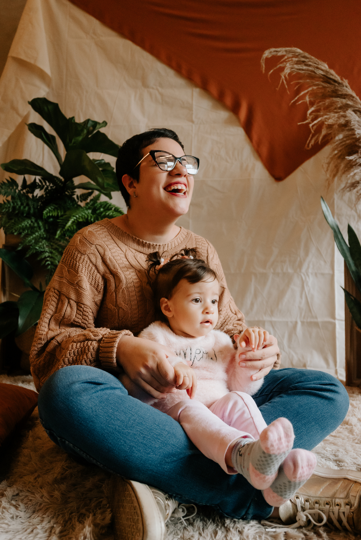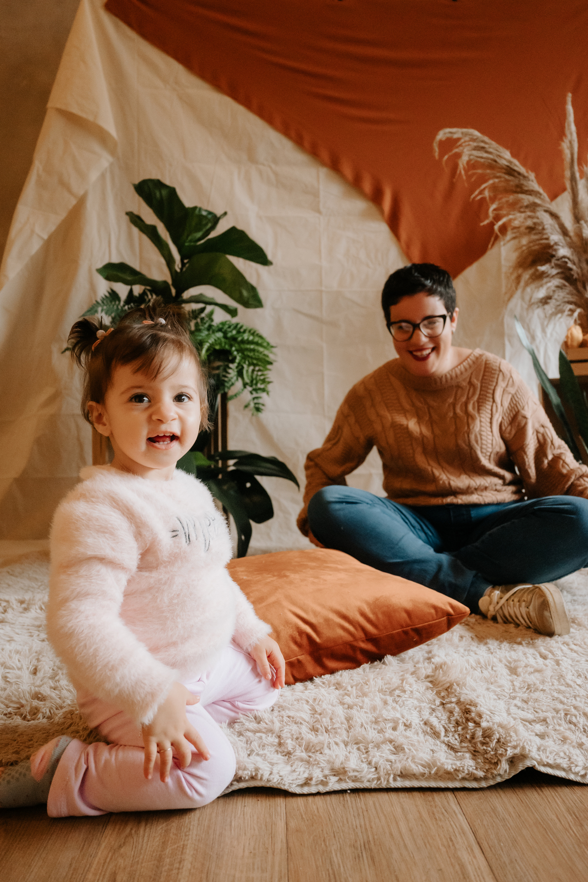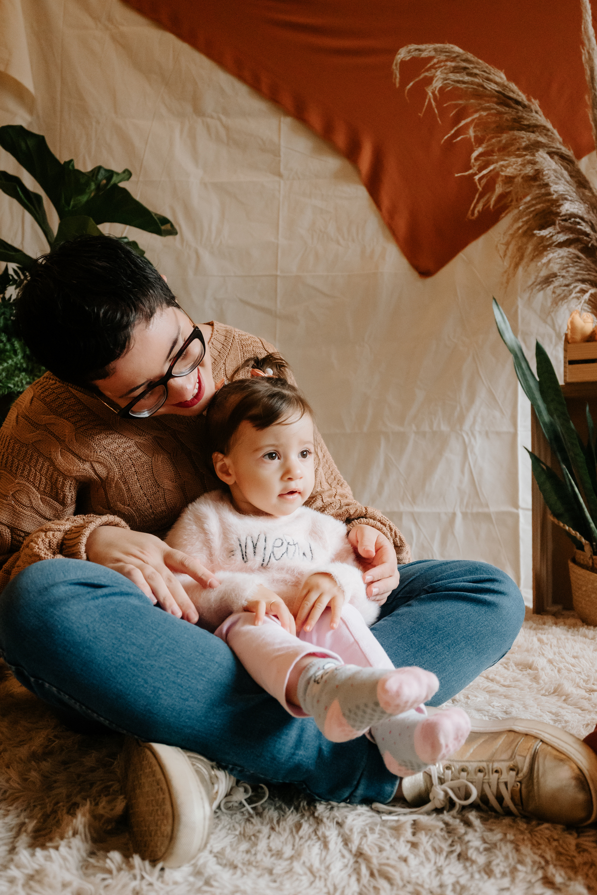 O ambiente do estúdio proporcionou um cenário íntimo e acolhedor, onde gestos simples como segurar as mãos ou brincar juntos se transformaram em imagens que eternizam a conexão única entre mãe e filha.