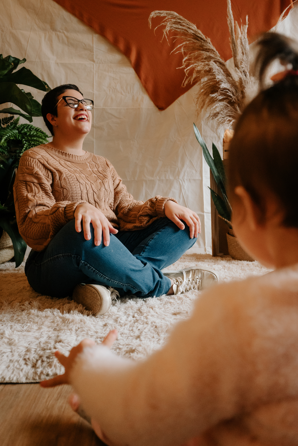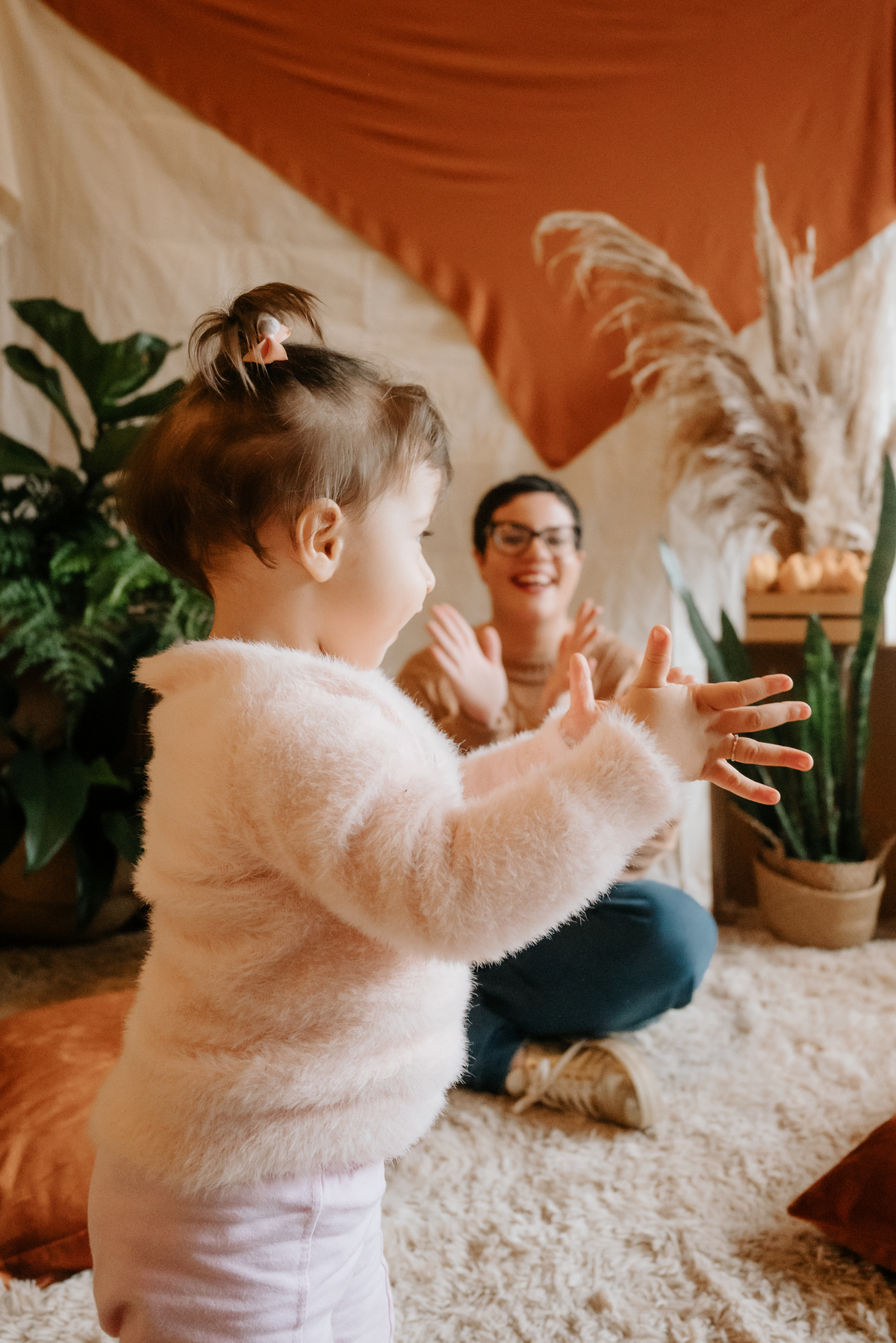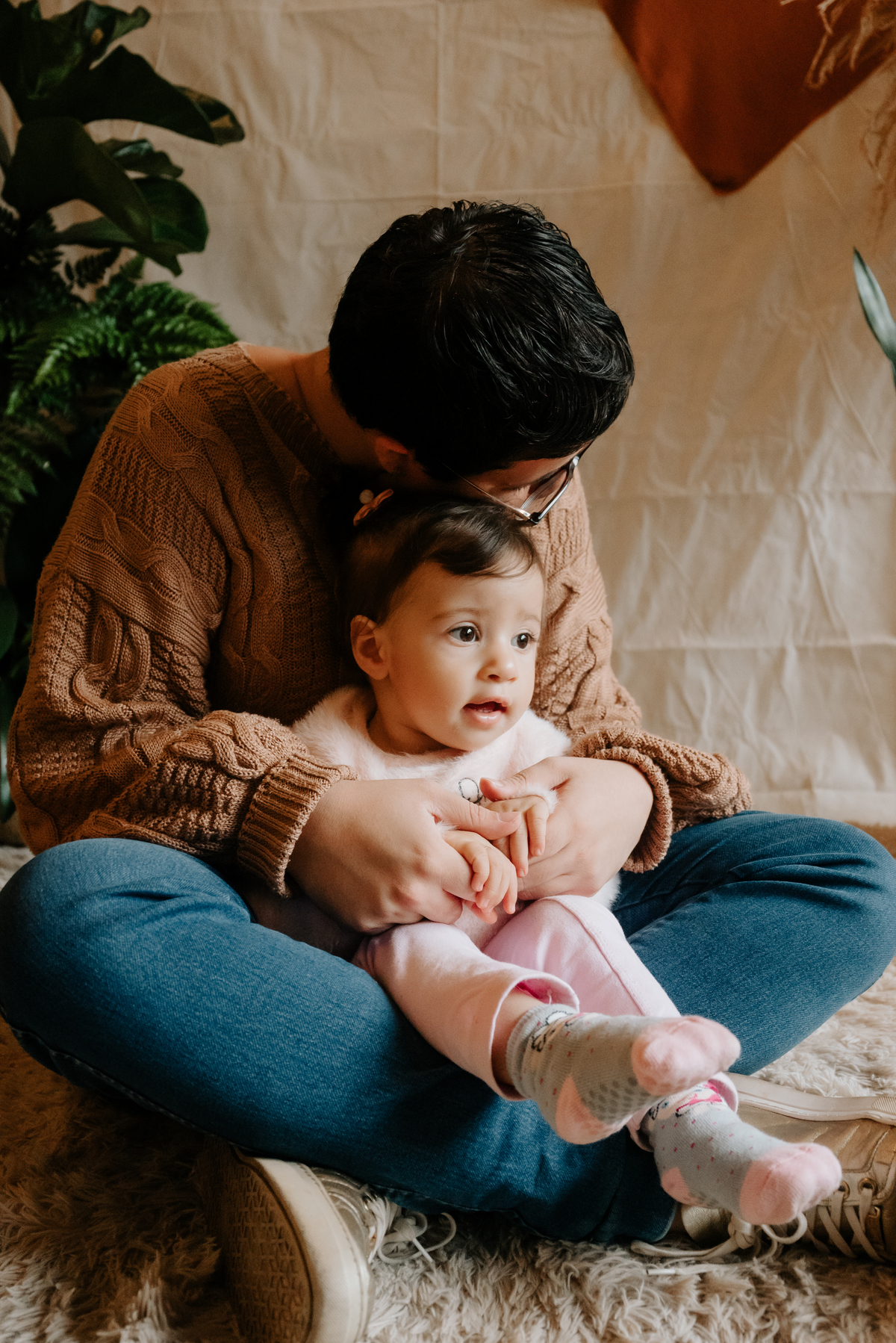 O ambiente do estúdio proporcionou um cenário íntimo e acolhedor, onde gestos simples como segurar as mãos ou brincar juntos se transformaram em imagens que eternizam a conexão única entre mãe e filha.