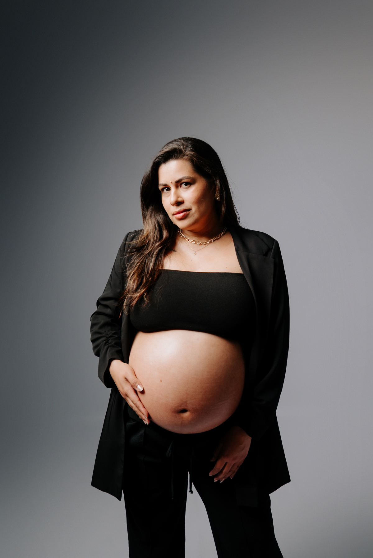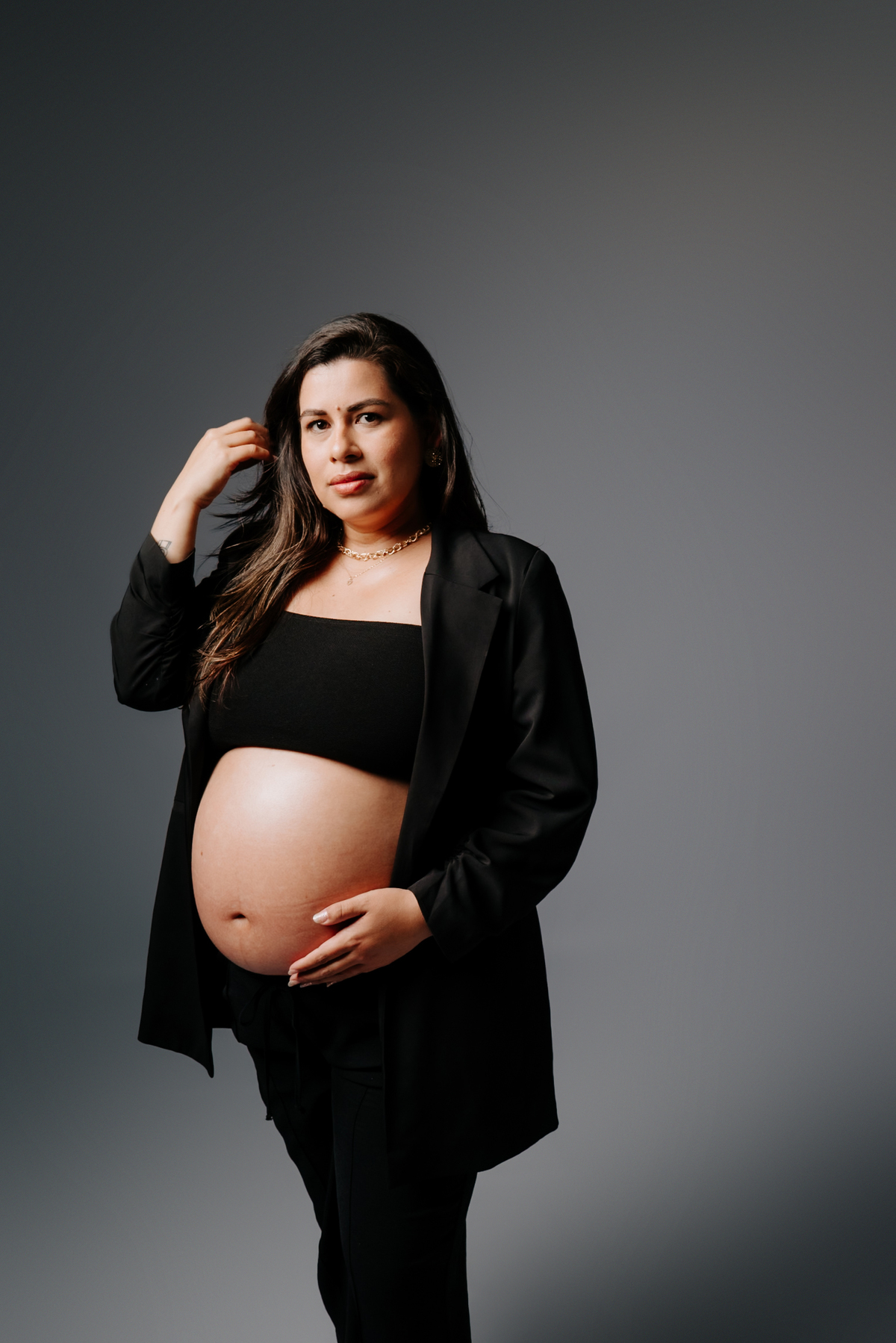 O ensaio aconteceu no novo estúdio em Gramado, em um ambiente minimalista, iluminado e cheio de aconchego. Cada detalhe foi pensado para valorizar a beleza e a conexão desse casal que vive intensamente essa fase tão especial.