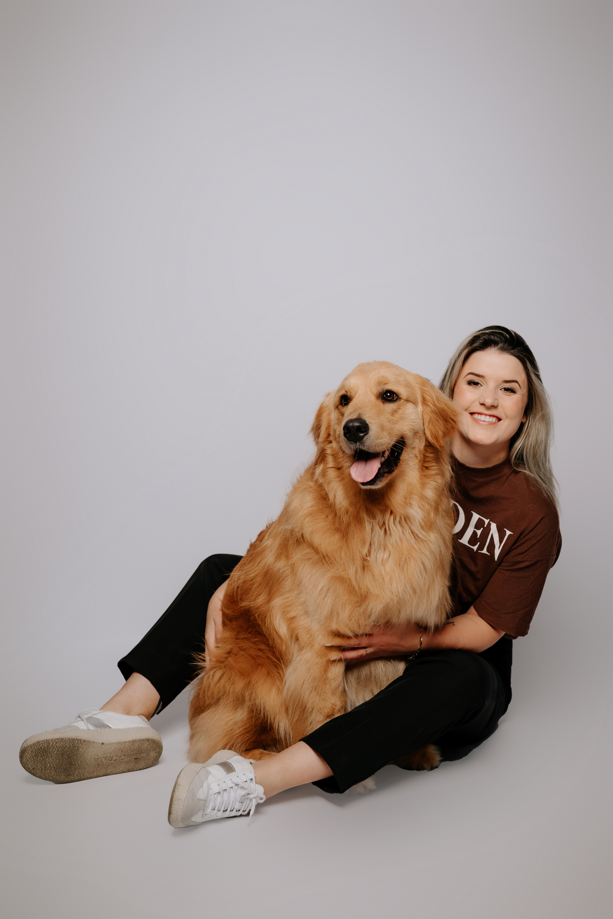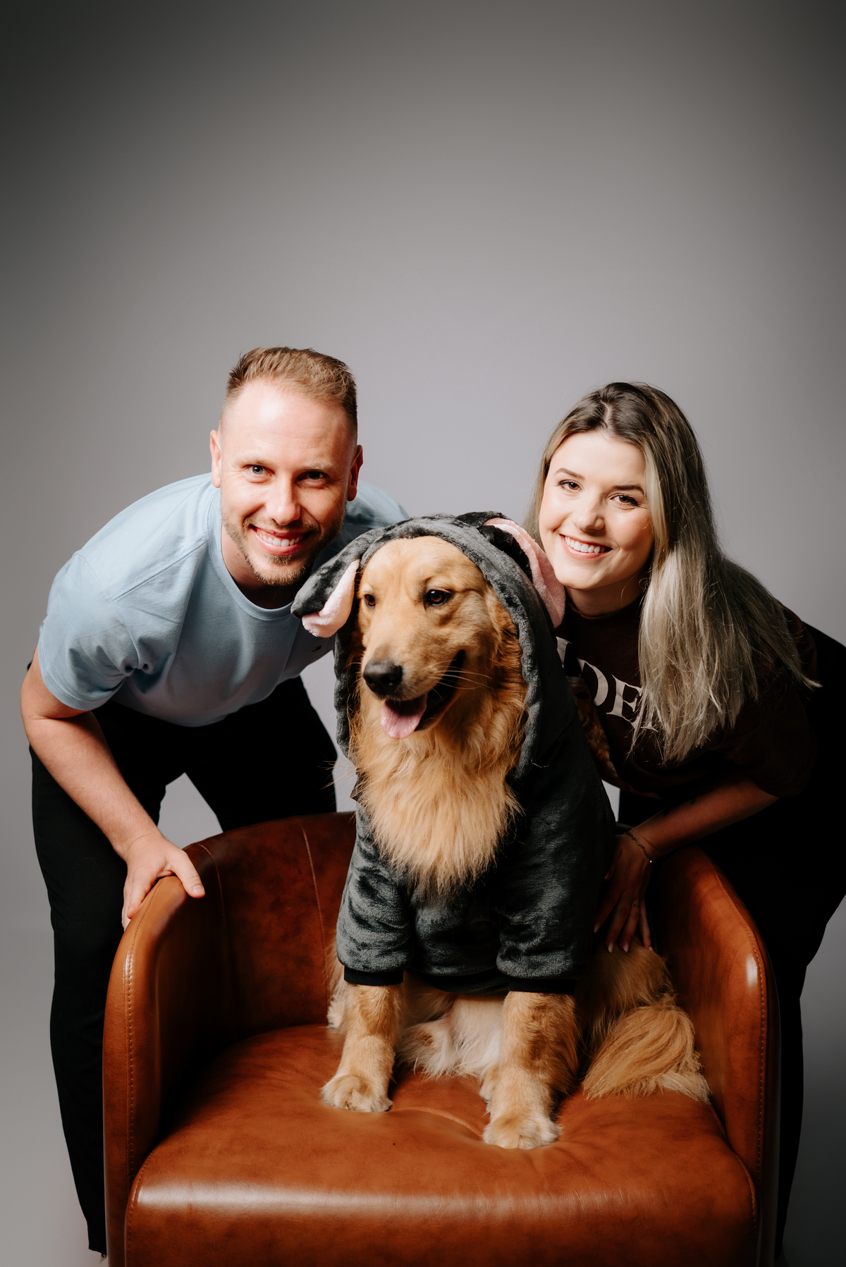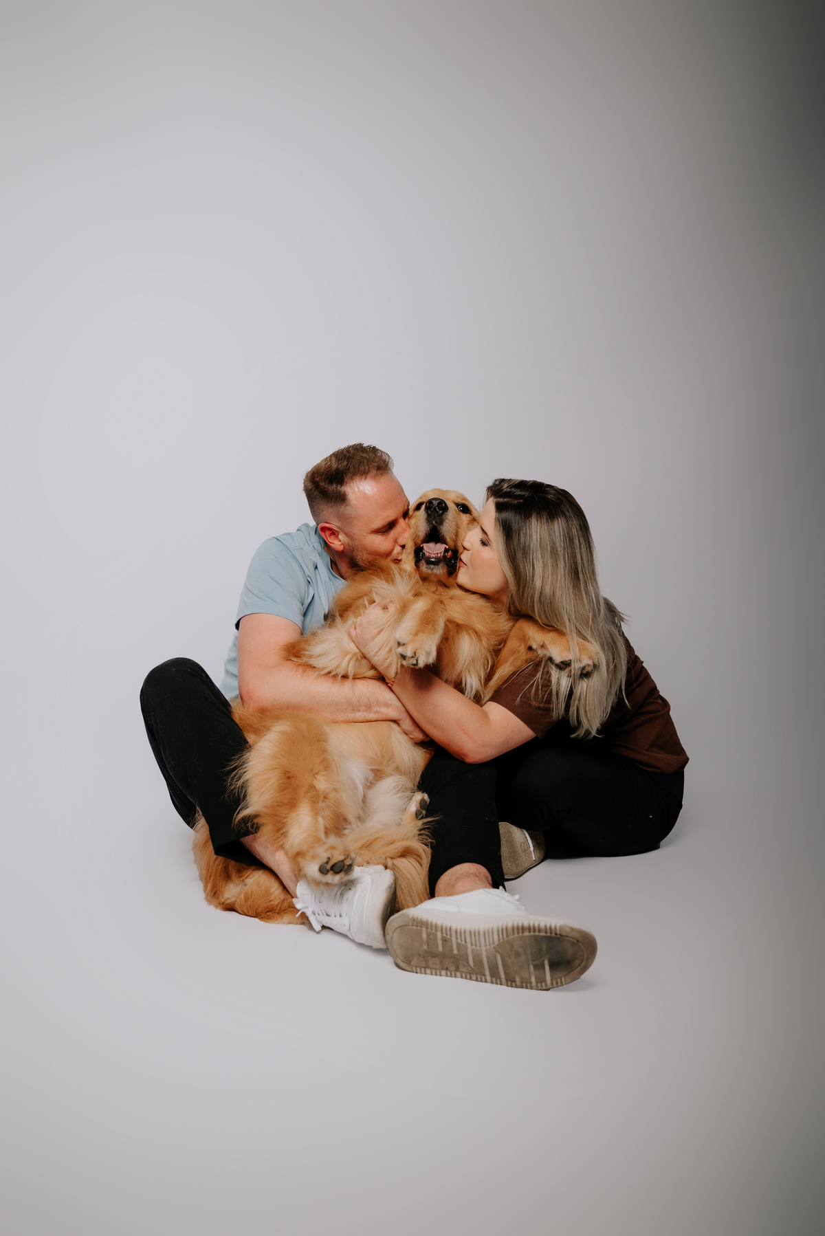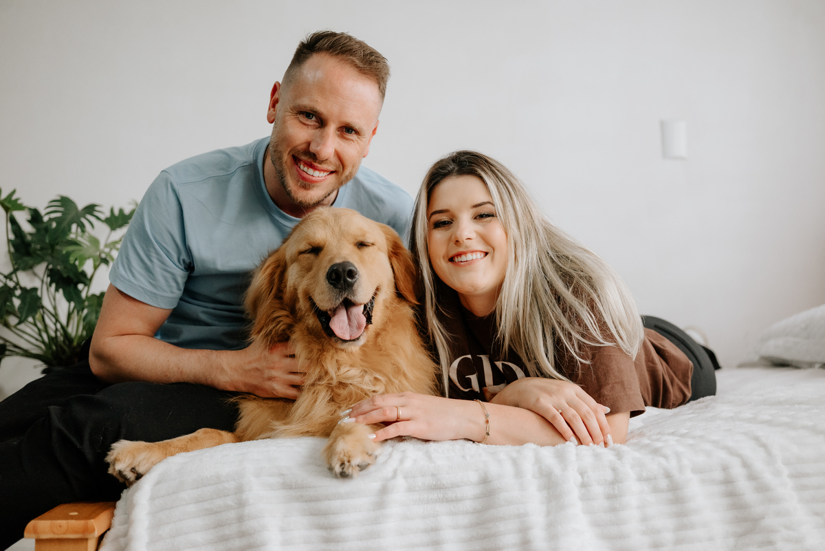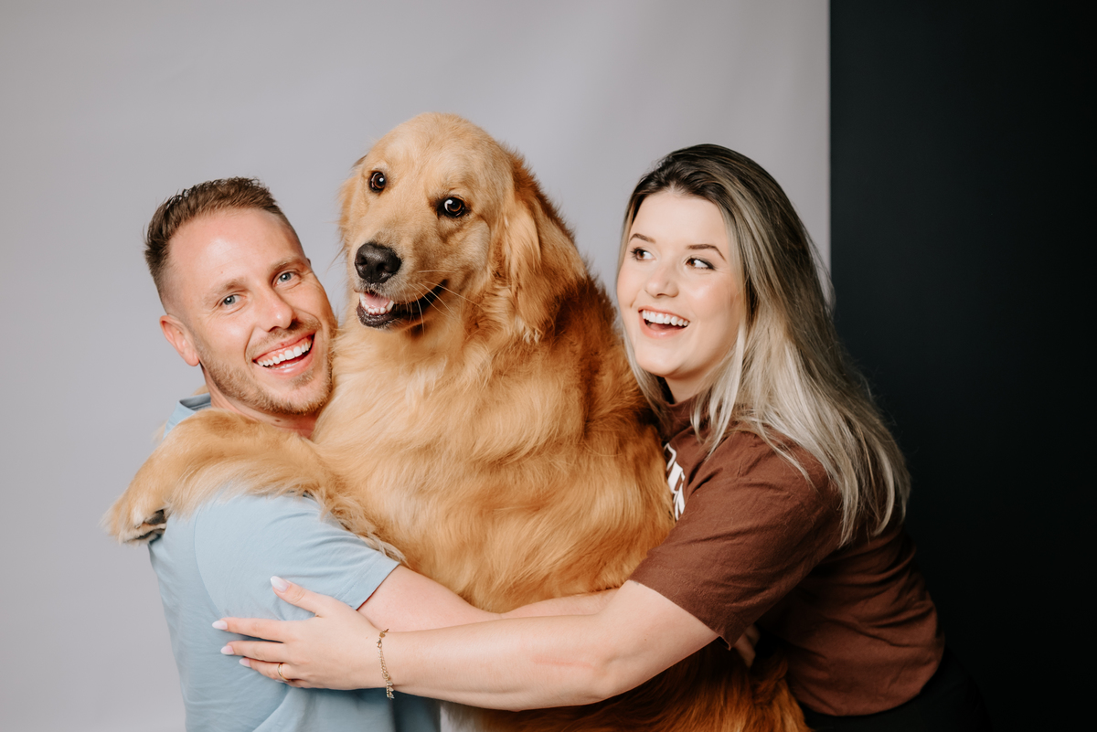 Algumas famílias chegam com quatro patas, muito amor e uma energia impossível de conter. O Pudim, um golden retriever pra lá de feliz e animado, veio ao estúdio acompanhado dos seus pais, Duda e Maiquel, para um ensaio que transborda afeto, conexão e espontaneidade.