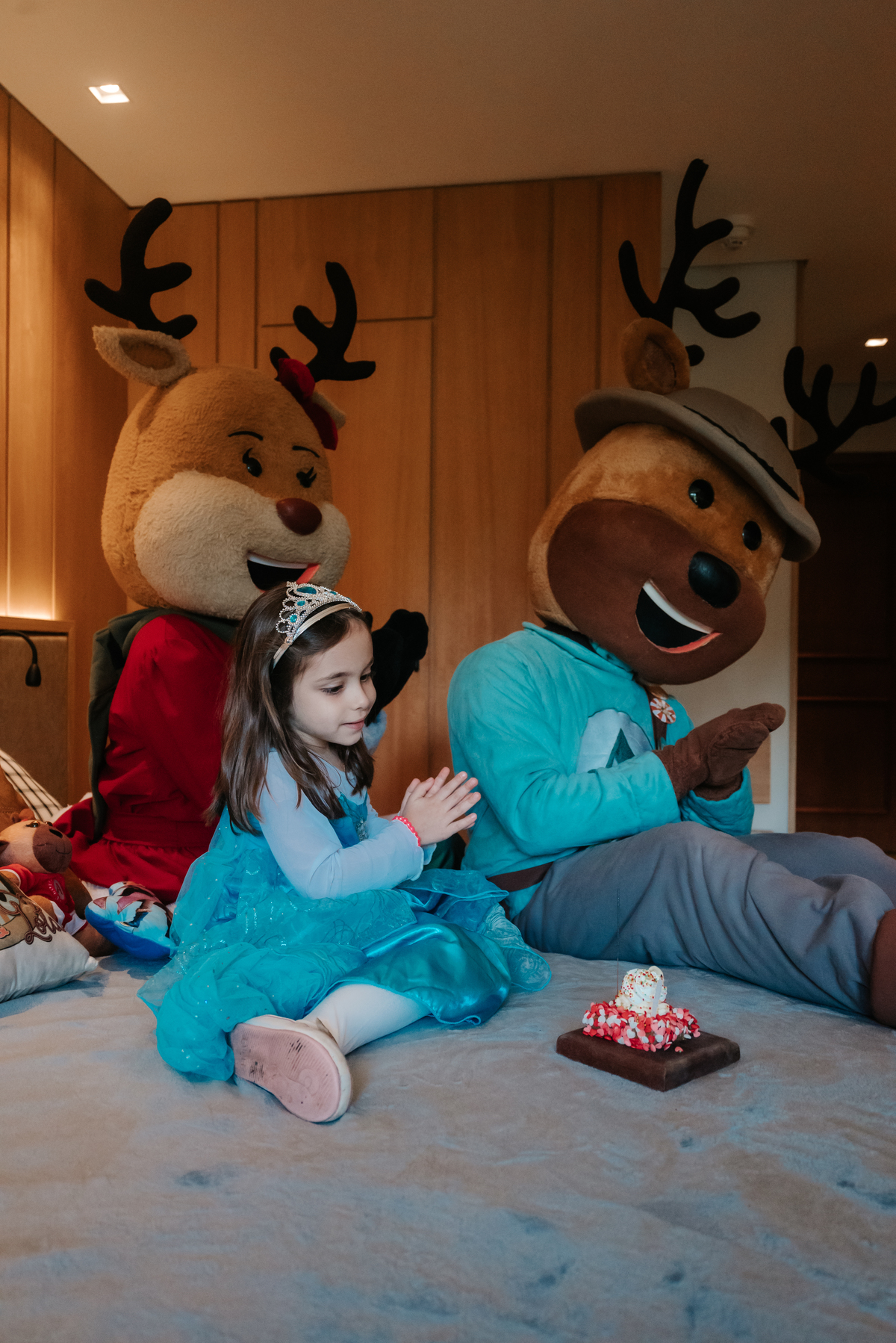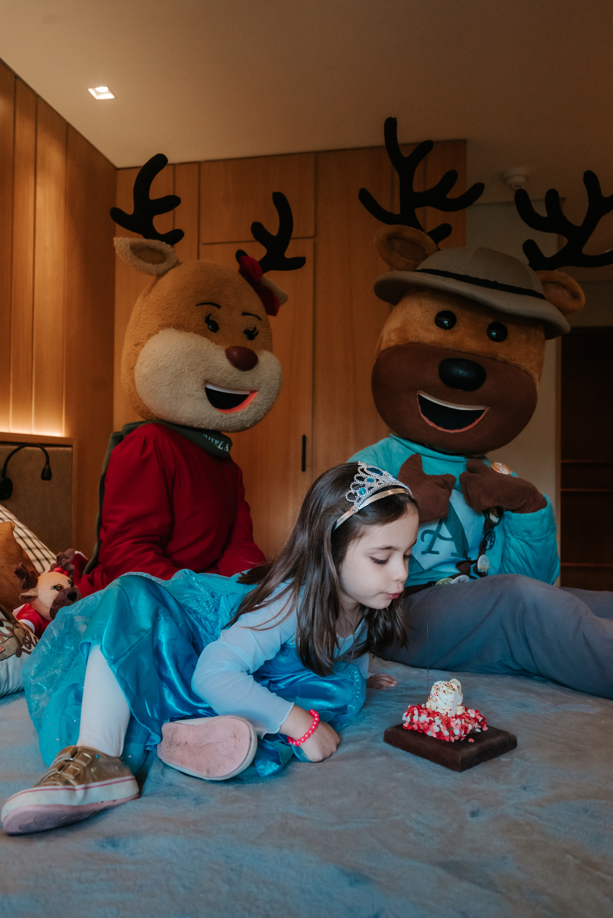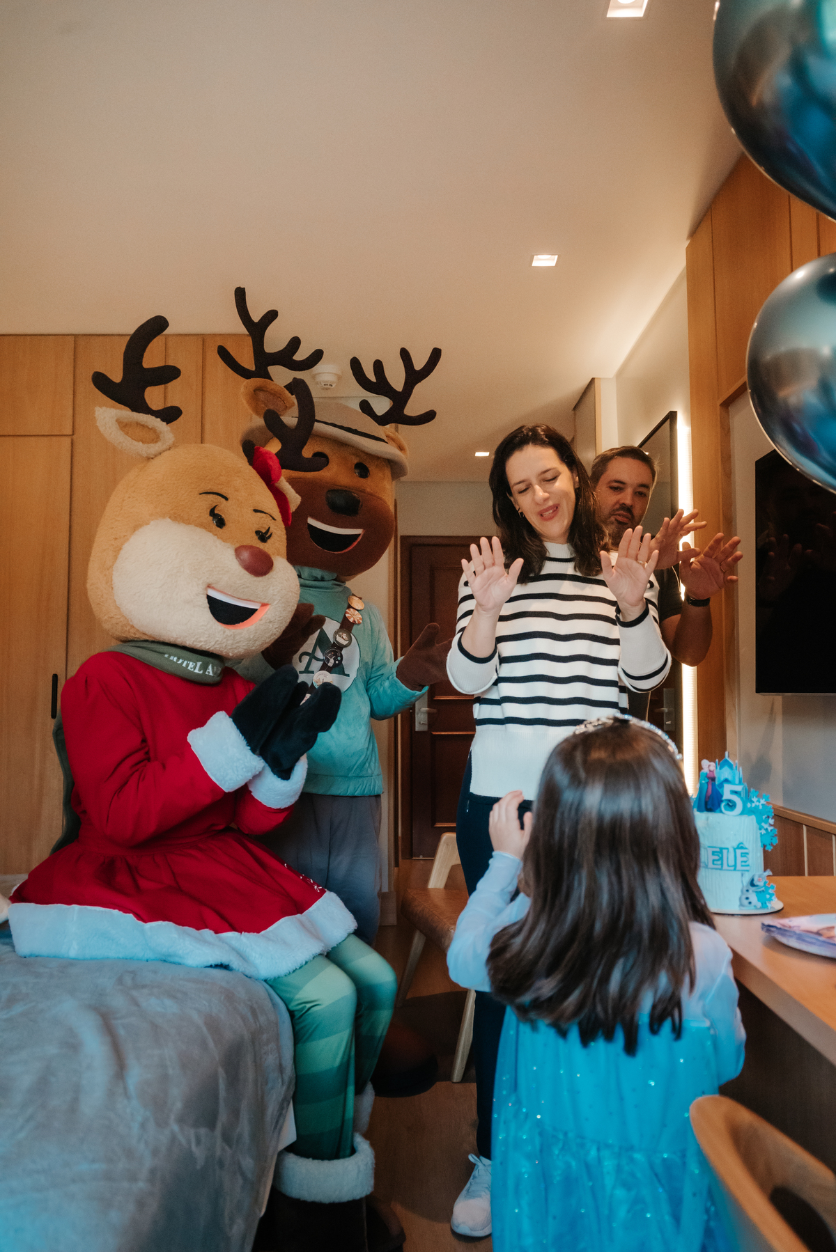 A Lelê, com seu sorriso contagiante, se divertiu ao lado dos adoráveis mascotes do hotel, o Alceu e a Lola. O cenário exuberante dos jardins do hotel e a atmosfera mágica proporcionaram o pano de fundo perfeito para registrar as doces lembranças desse dia especial.