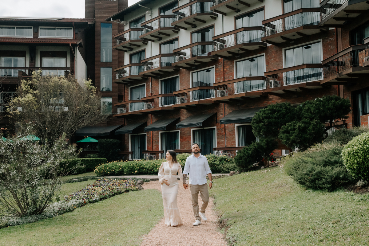 O casal está à espera de uma menina, e cada detalhe desse momento foi pensado com carinho. O cenário do Hotel Alpestre, com seus jardins encantadores e a atmosfera acolhedora típica da Serra Gaúcha, trouxe um toque mágico para as fotos.