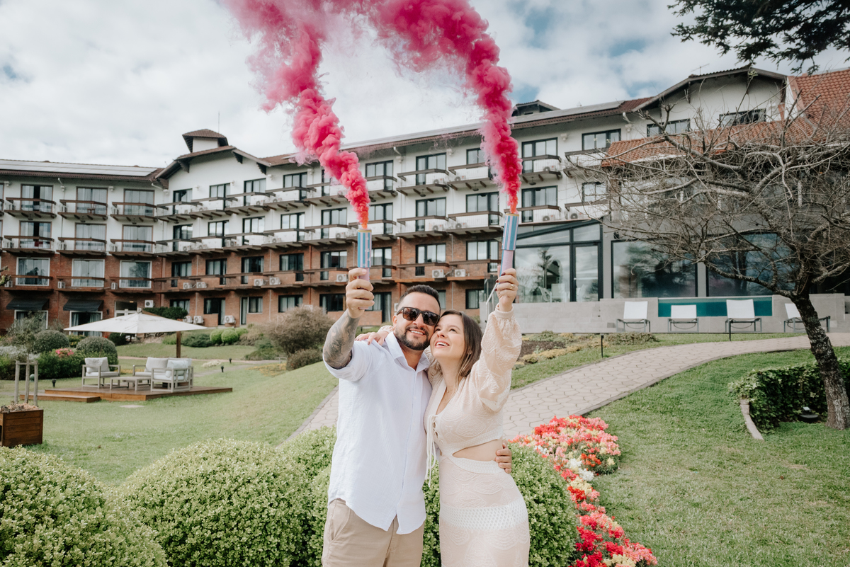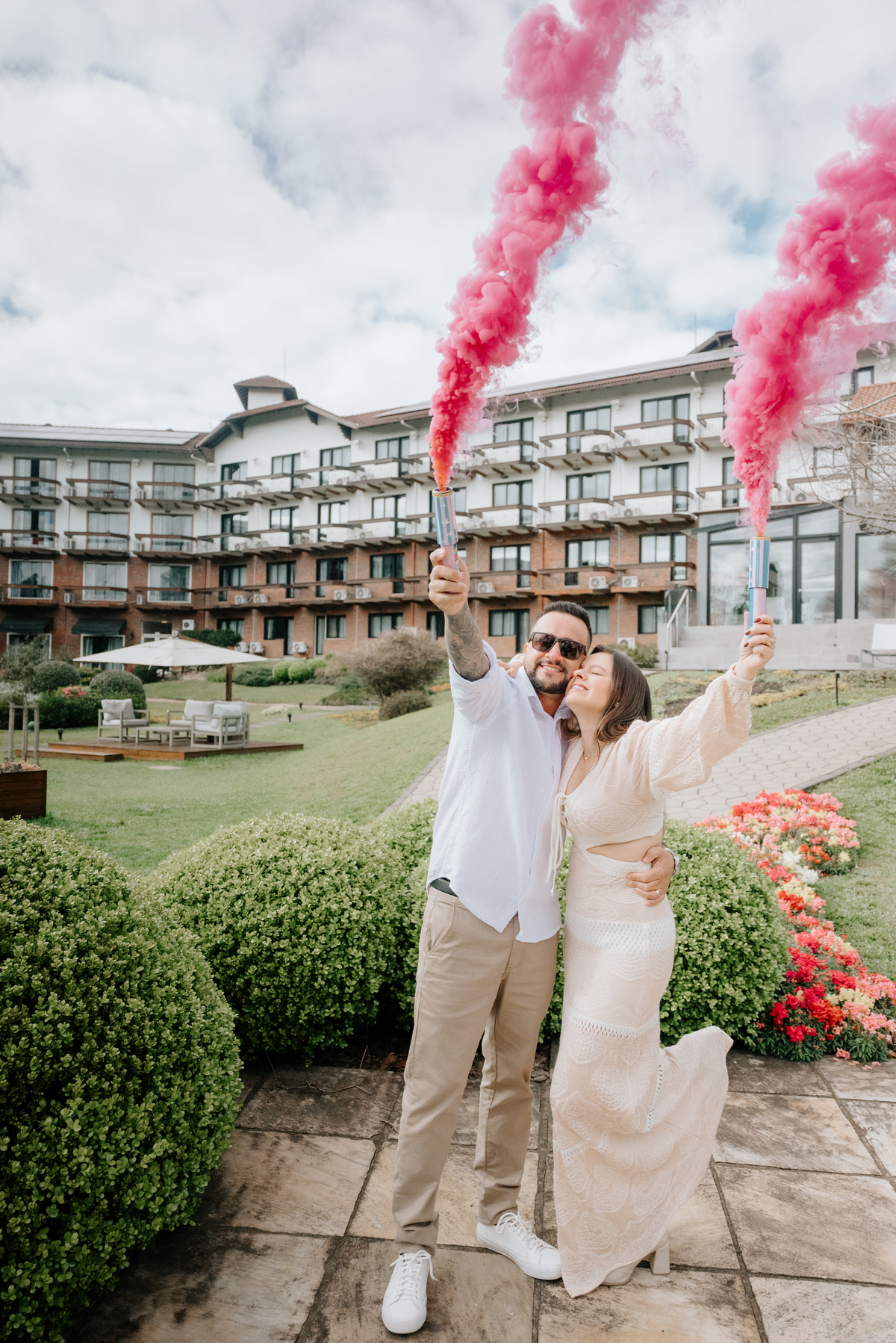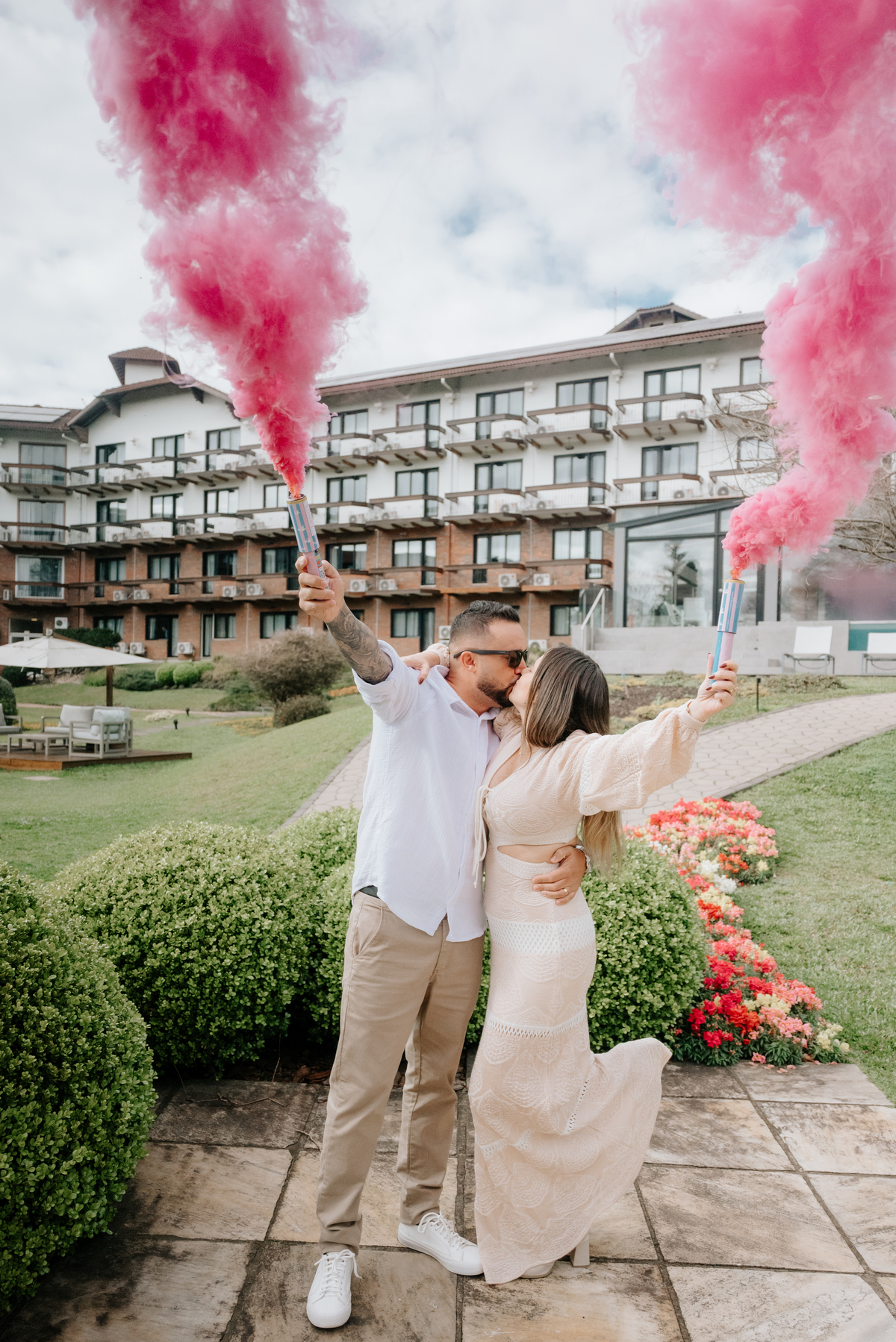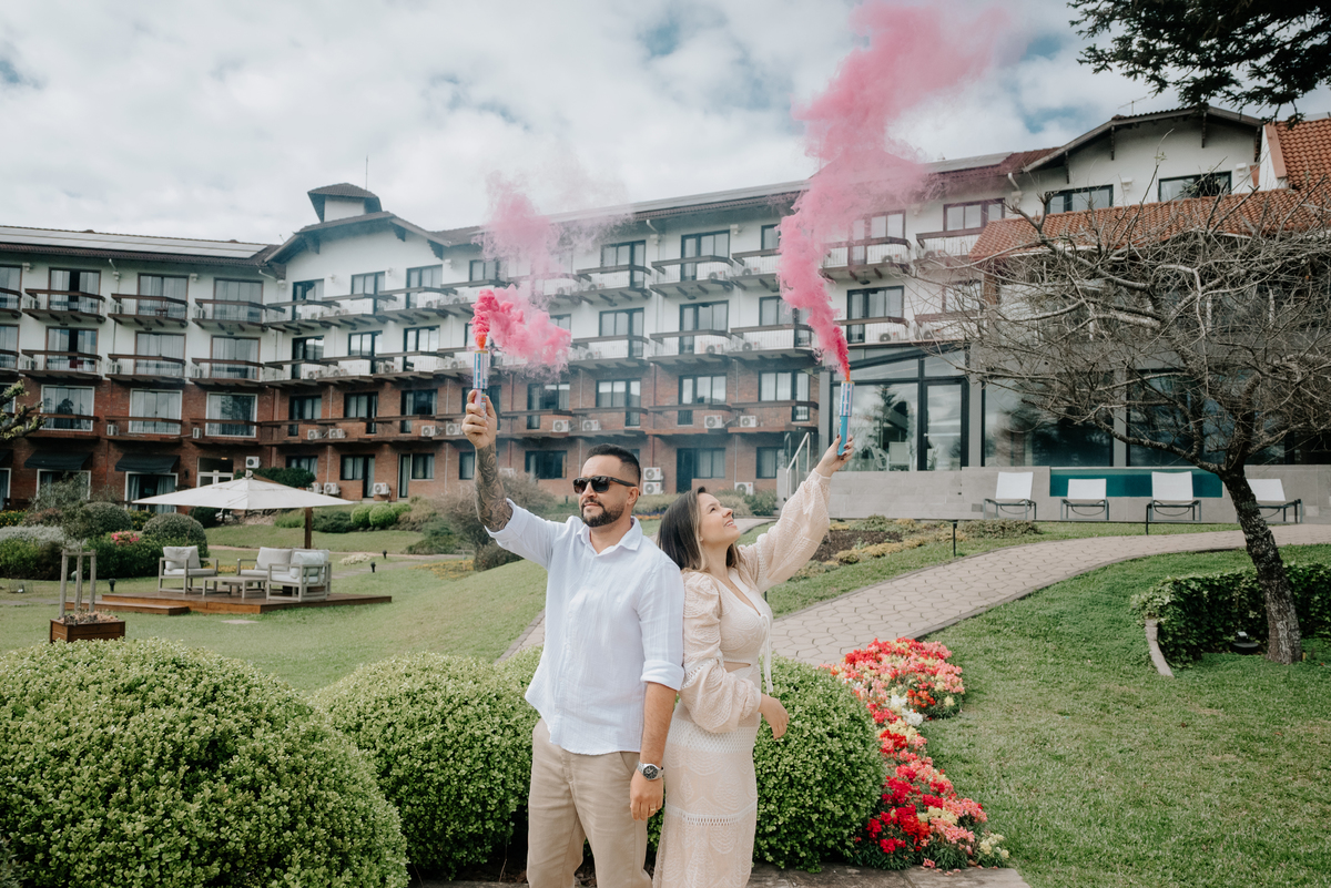 Poucos momentos são tão emocionantes quanto descobrir — e revelar — o sexo de um bebê. E o ensaio de revelação da Sayure e do Vitor, realizado no Hotel Alpestre em Gramado, foi exatamente isso: uma tarde repleta de amor, expectativa e felicidade. 💕