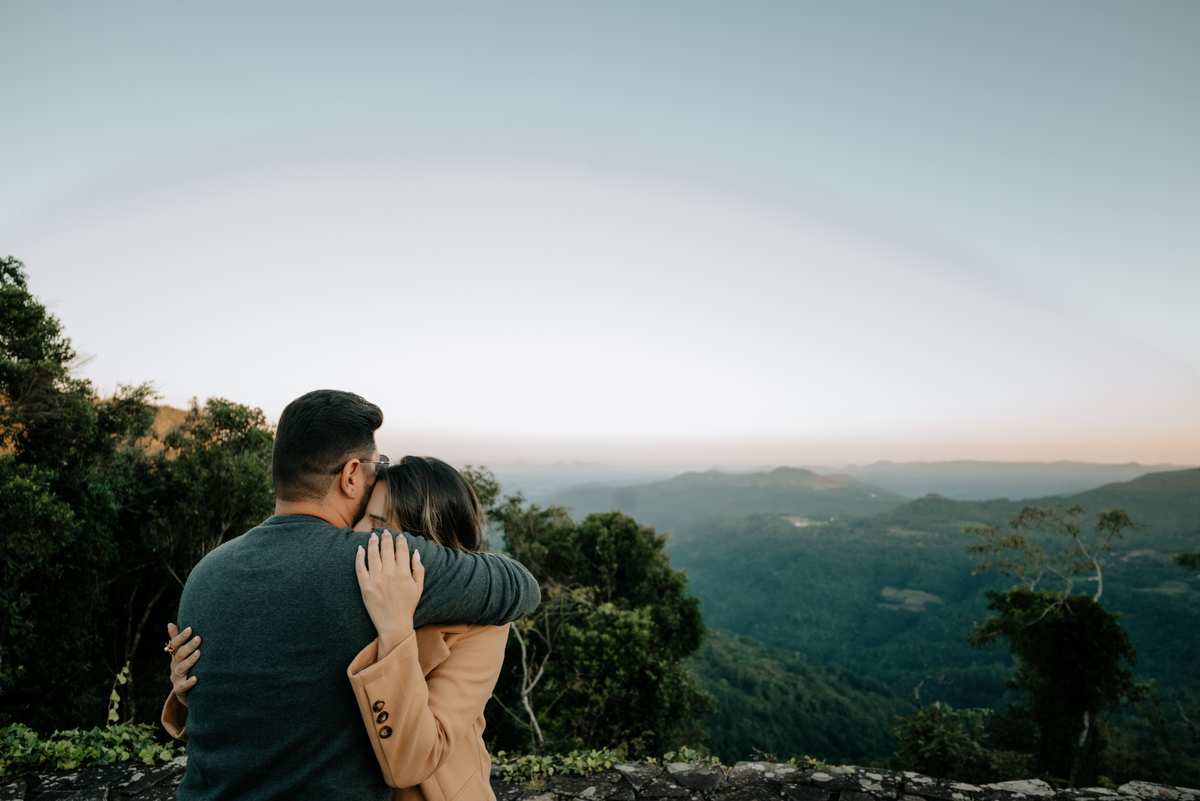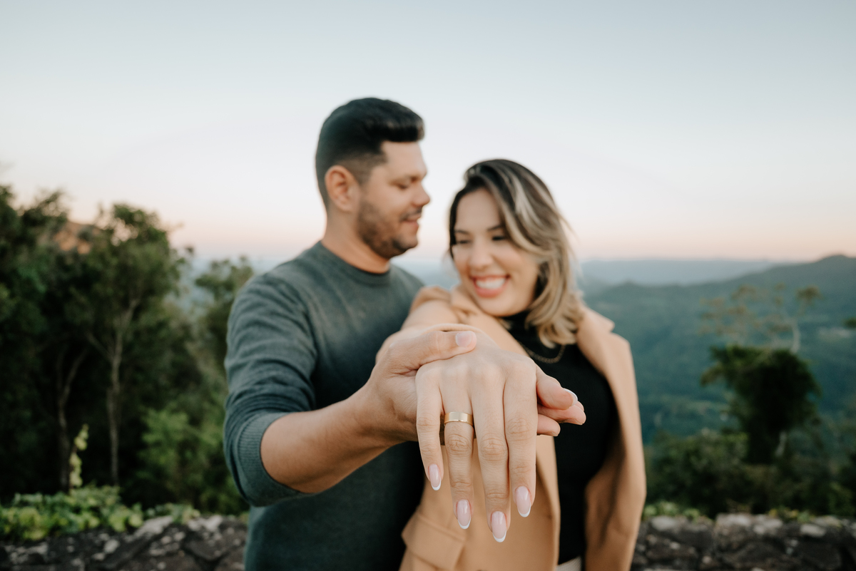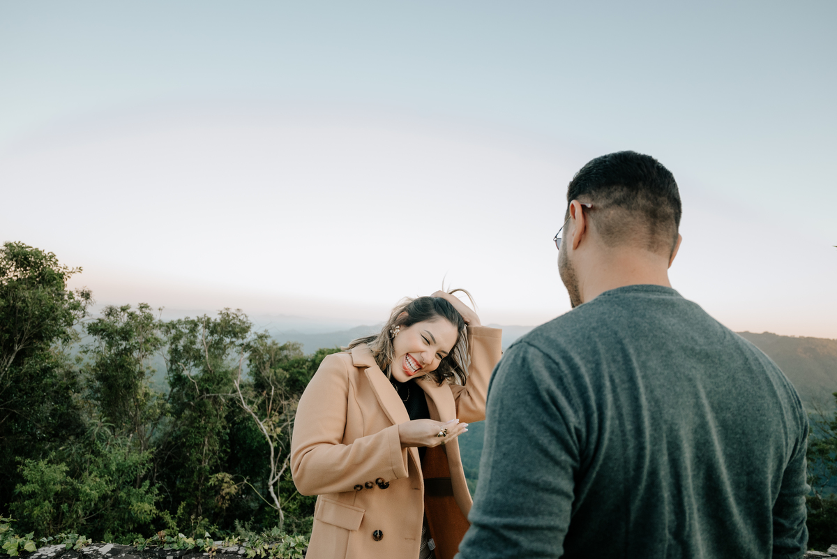 O Danilo idealizou um local, não foi possível, não permitiam a entrada de câmeras profissionais e um evento acontecia no local. Mesmo assim, utilizamos o espaço comum do Hotel Laje de Pedra, um mirante lindíssimo com uma vista de tirar o fôlego. Lá criamos uma cena, eu estava fotografando o local, me pediram alguns registros e, quando nem eu esperava, o Danilo ajoelhou e a emoção da Rayla surgiu.