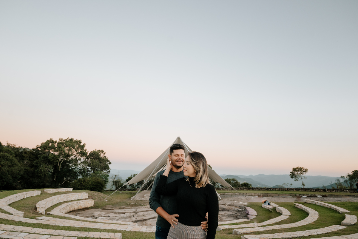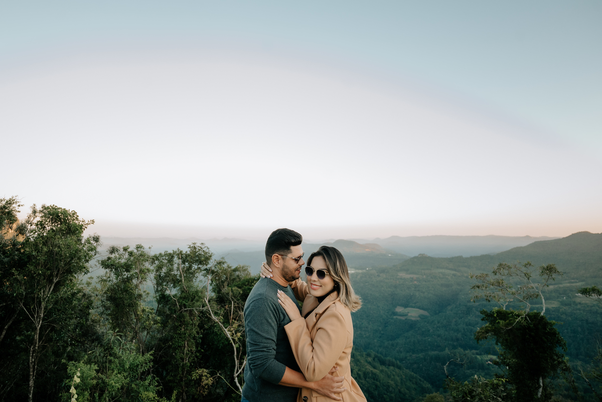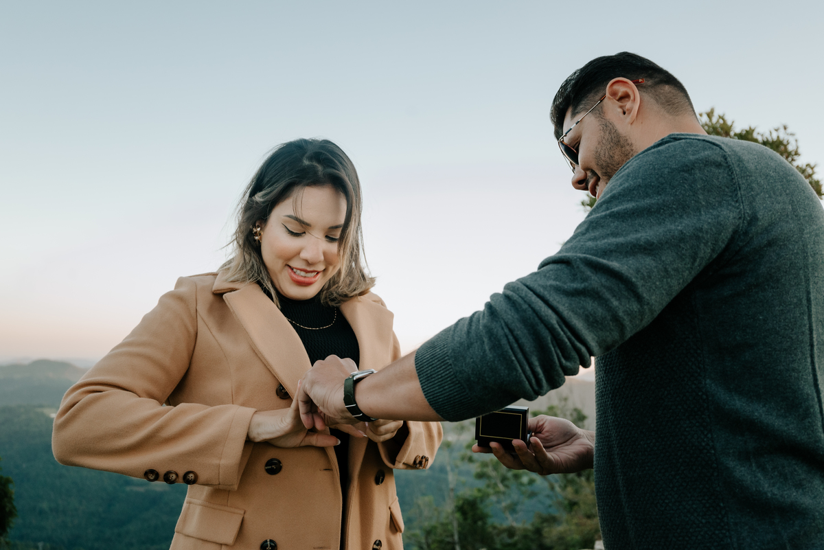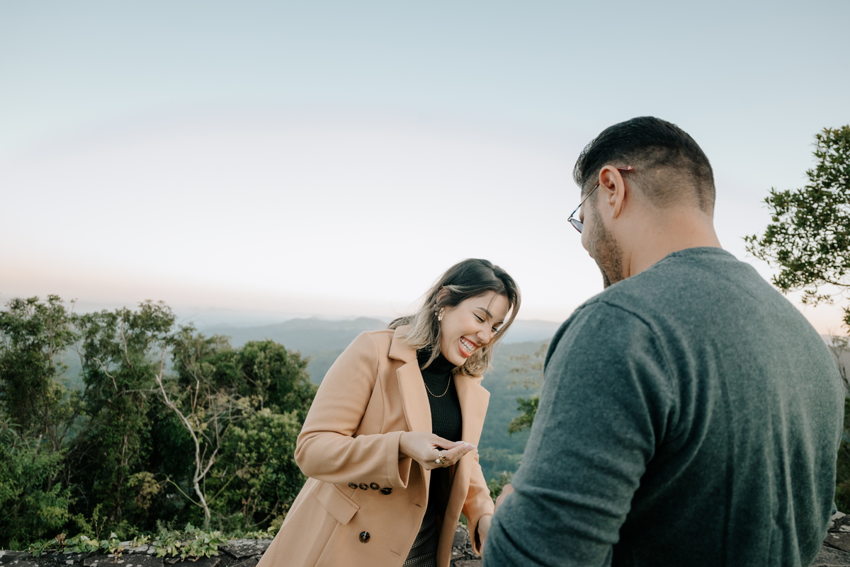 O Danilo idealizou um local, não foi possível, não permitiam a entrada de câmeras profissionais e um evento acontecia no local. Mesmo assim, utilizamos o espaço comum do Hotel Laje de Pedra, um mirante lindíssimo com uma vista de tirar o fôlego. Lá criamos uma cena, eu estava fotografando o local, me pediram alguns registros e, quando nem eu esperava, o Danilo ajoelhou e a emoção da Rayla surgiu.