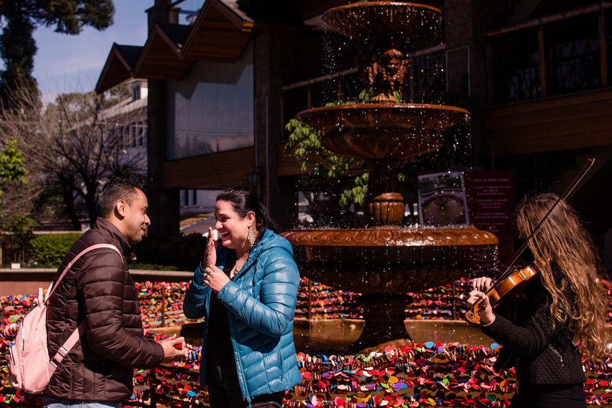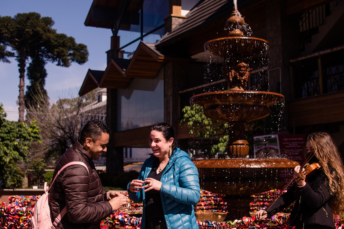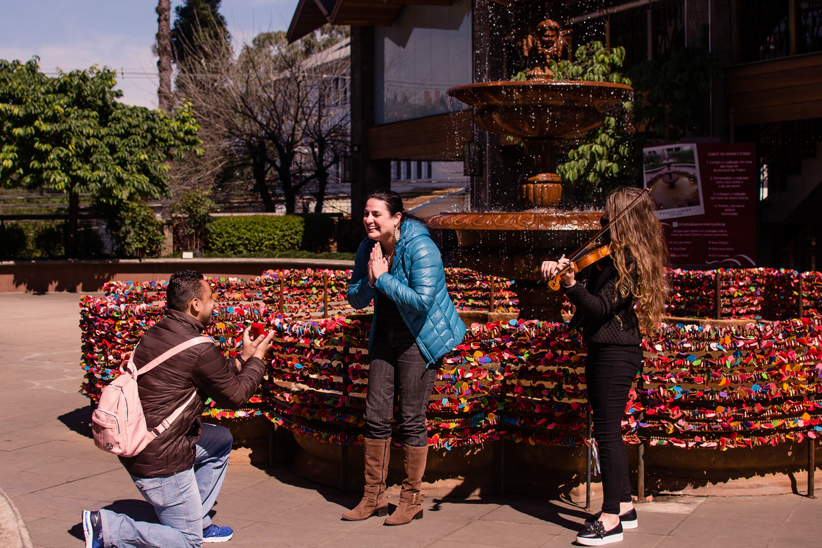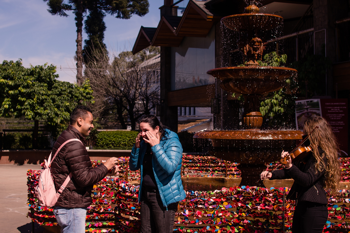 O Adriano conversou comigo semanas antes, também entrou em contato com a violinista Isabel, ambas estávamos ali fingindo costume na Fonte do Amor Eterno. Sentadas num cantinho do espaço, aguardávamos o sinal que chegou ao som da música do casal. Comecei a me aproximar, Adriano se ajoelhou, Lívia se emocionou e mais um SIM registrado com todos os melhores sentimentos.