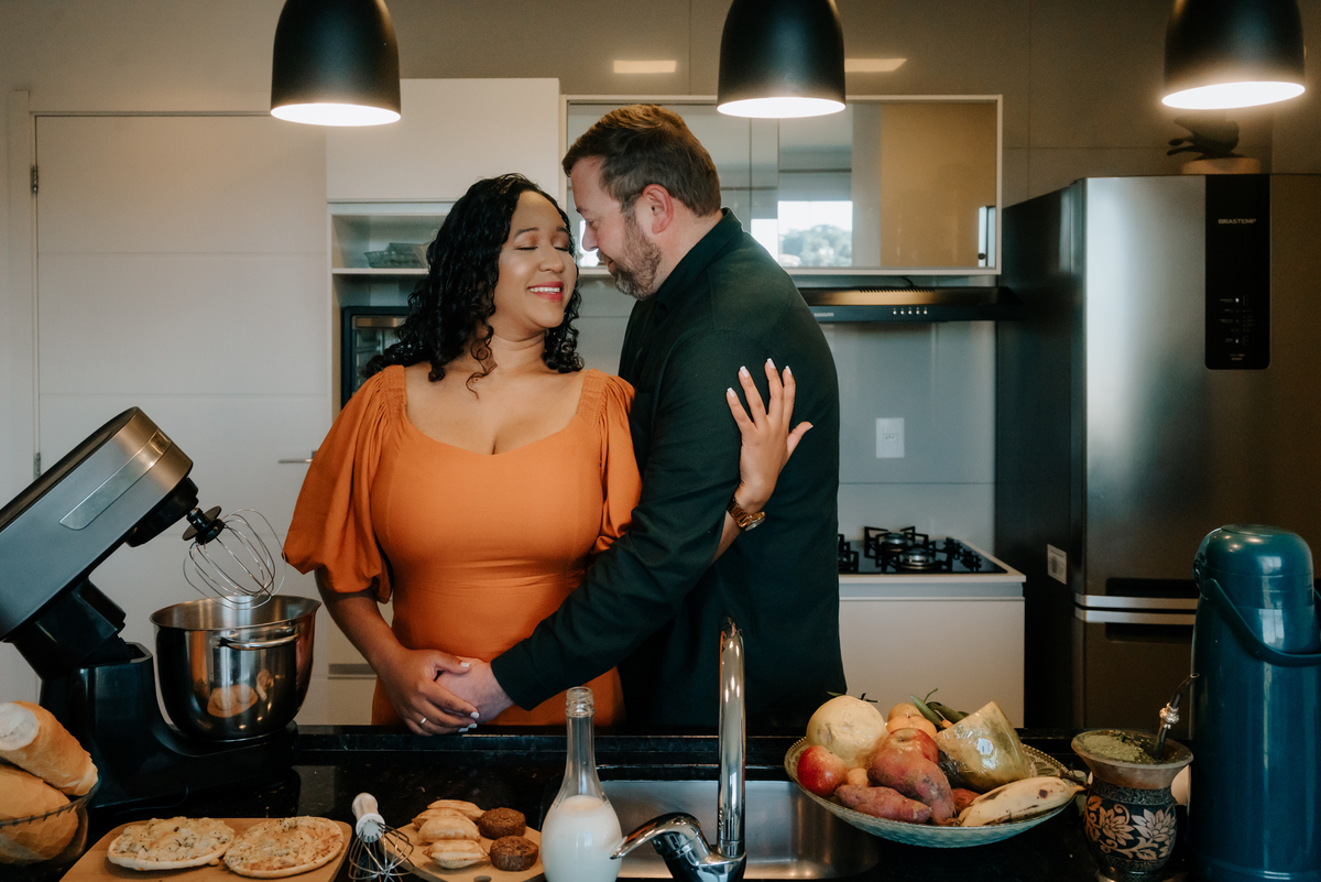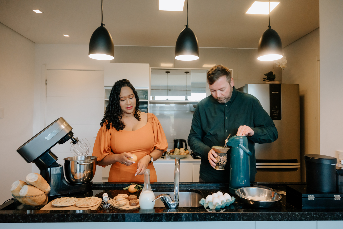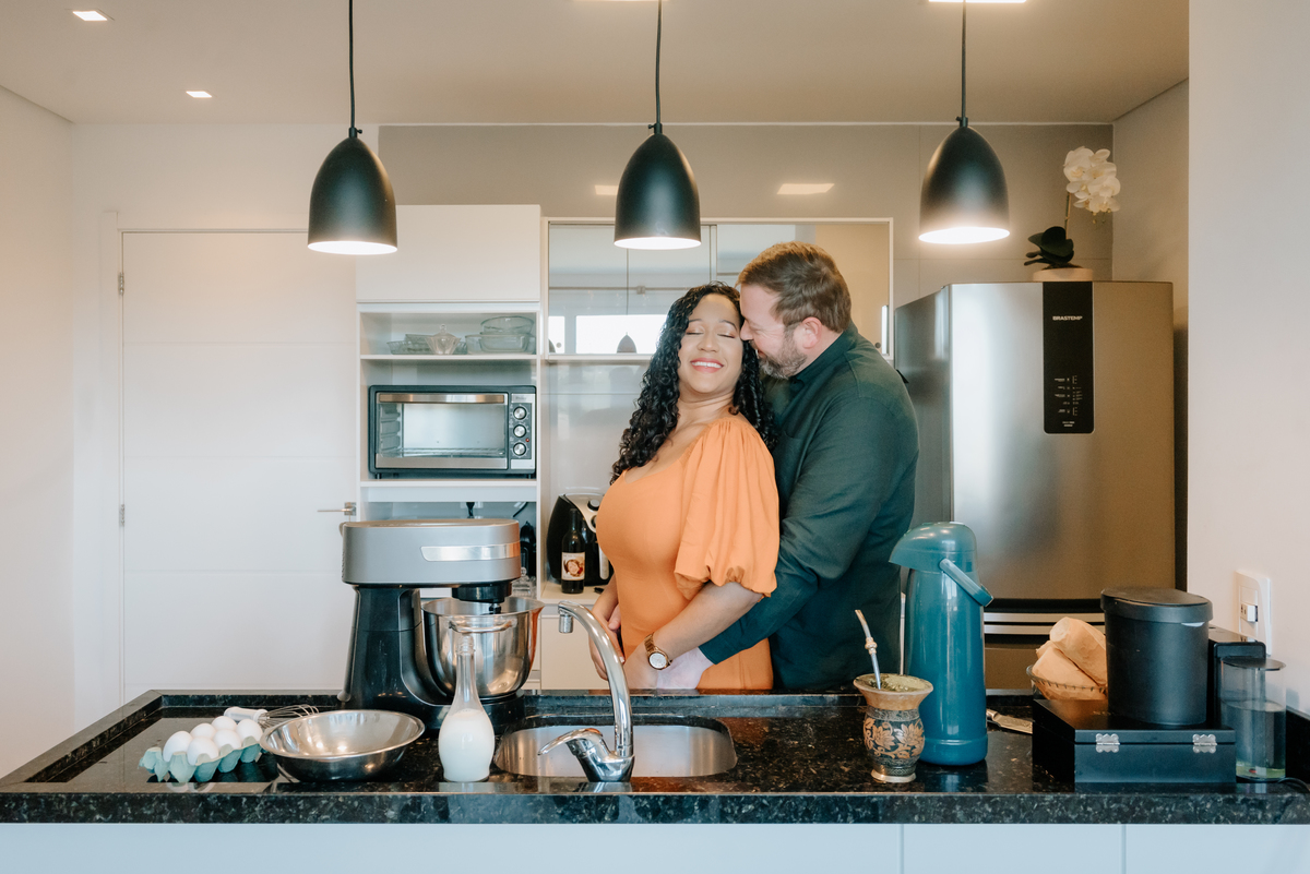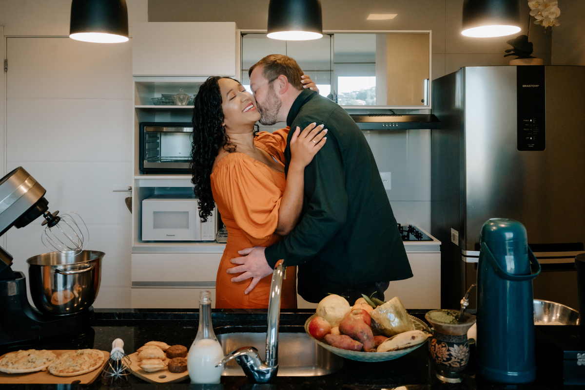 Escolhemos a cozinha, um lugar que tem muito significado para eles, e isso tornou o ensaio ainda mais autêntico.