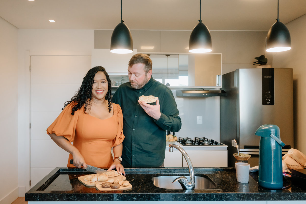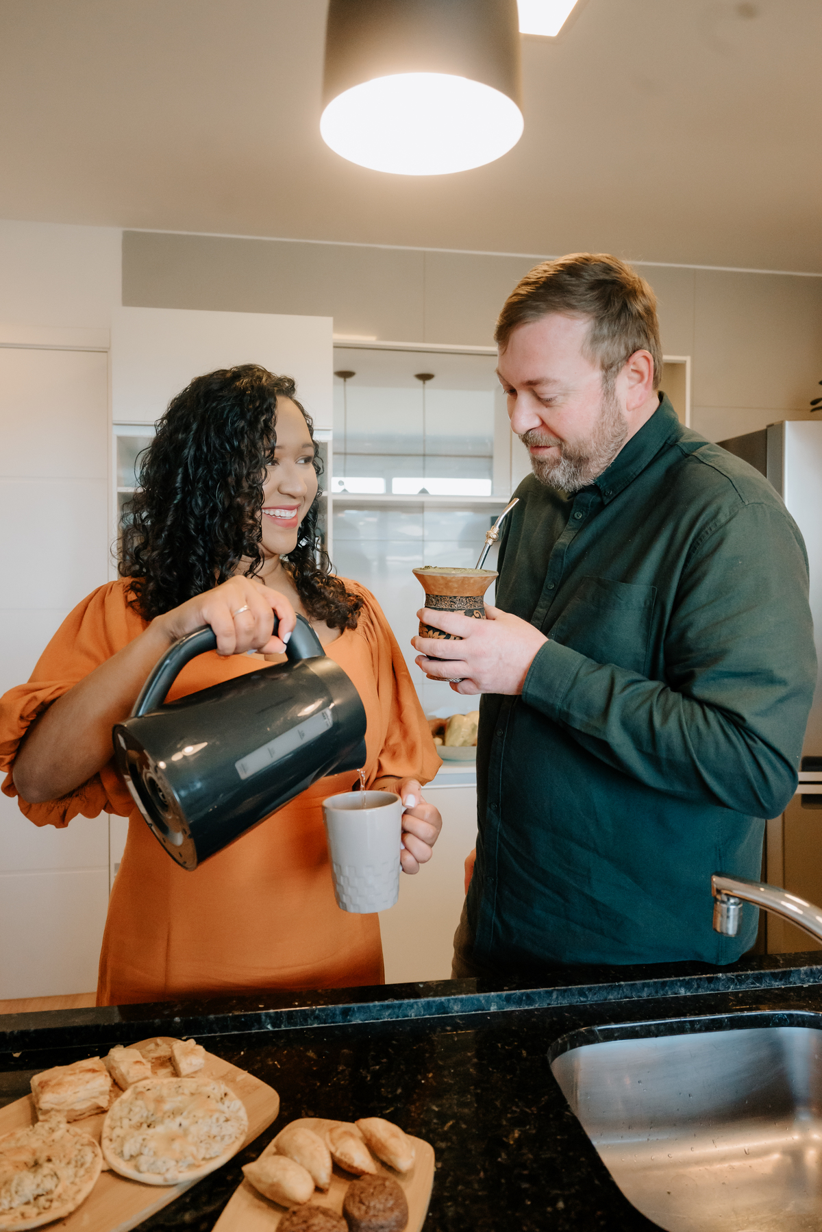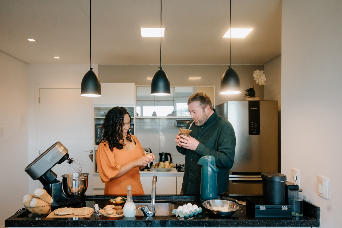 Escolhemos a cozinha, um lugar que tem muito significado para eles, e isso tornou o ensaio ainda mais autêntico.