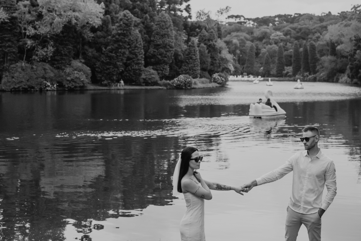 O Lago Negro, com suas águas tranquilas e rodeado por uma vegetação exuberante, é um dos locais mais procurados para ensaios fotográficos em Gramado. E não poderia ser diferente: Ká e Douglas, com sua sintonia e cumplicidade, foram o casal perfeito para se deixar envolver pela beleza natural desse lugar. As fotos capturaram momentos de leveza, alegria e um amor que transbordava em cada olhar e gesto.